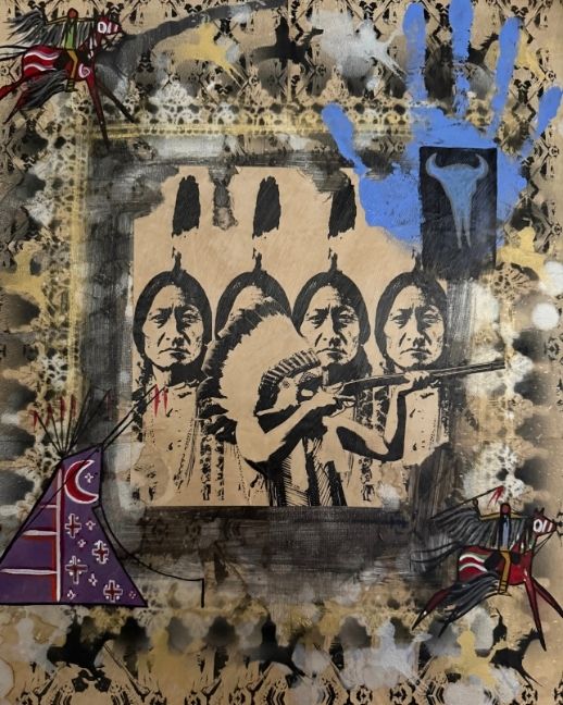 Ben Nelson (The Son of Picasso) is a federally recognized Kiowa artist with Diné, Taos Pueblo, and Delaware heritage. A Southwestern Association for Indian Arts award winner, his work bridges fine art, graffiti, and streetwear, creating bold, thought-provoking compositions that challenge and reclaim the visual narrative of Indigenous representation.