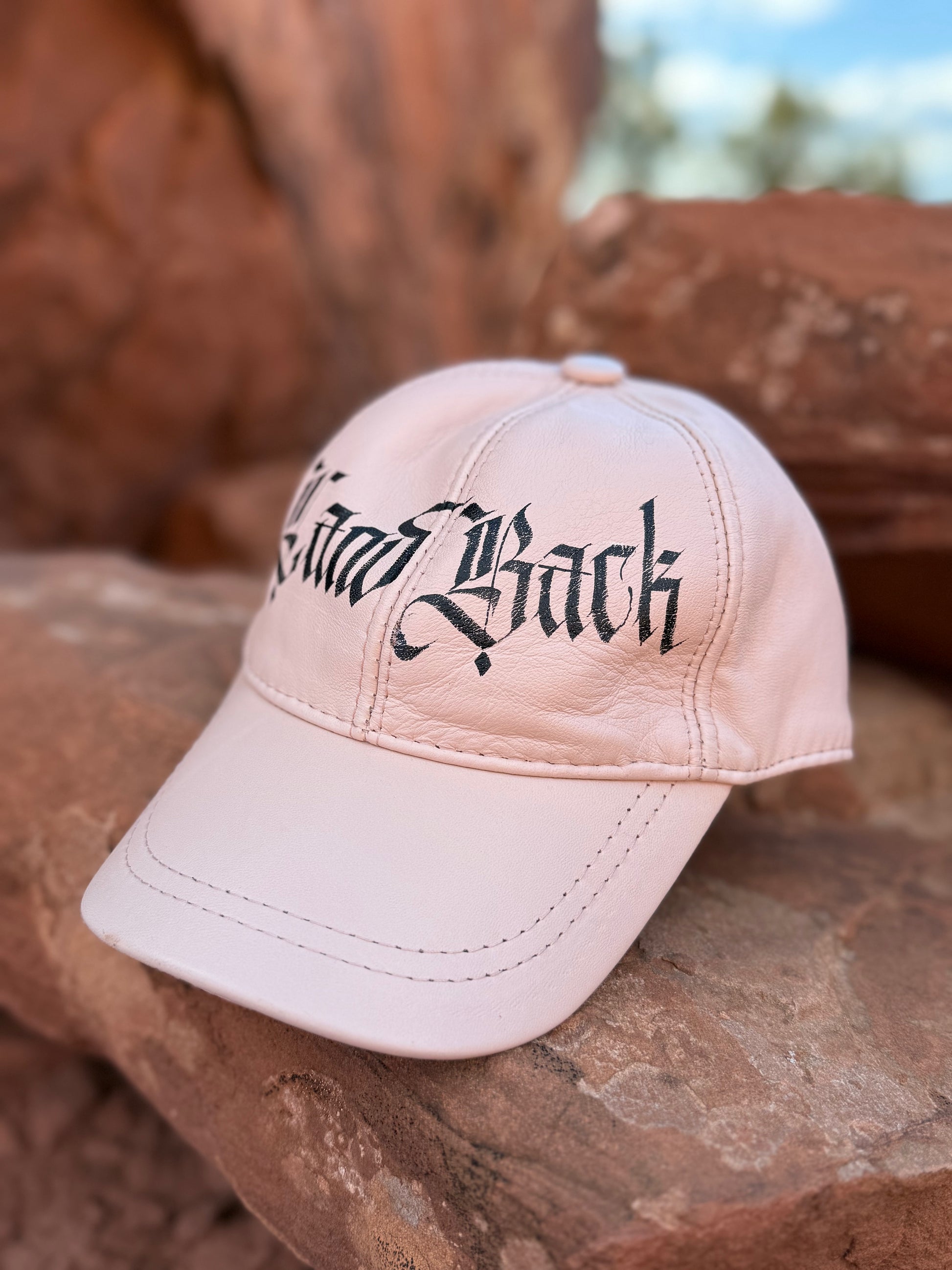 Hand-painted calligraphy by Diné (Navajo) artist Blythe Marino transforms this lambskin leather cap into a piece of wearable art. Marino’s work blends contemporary lettering with messages rooted in Indigenous sovereignty, care, and cultural protection.