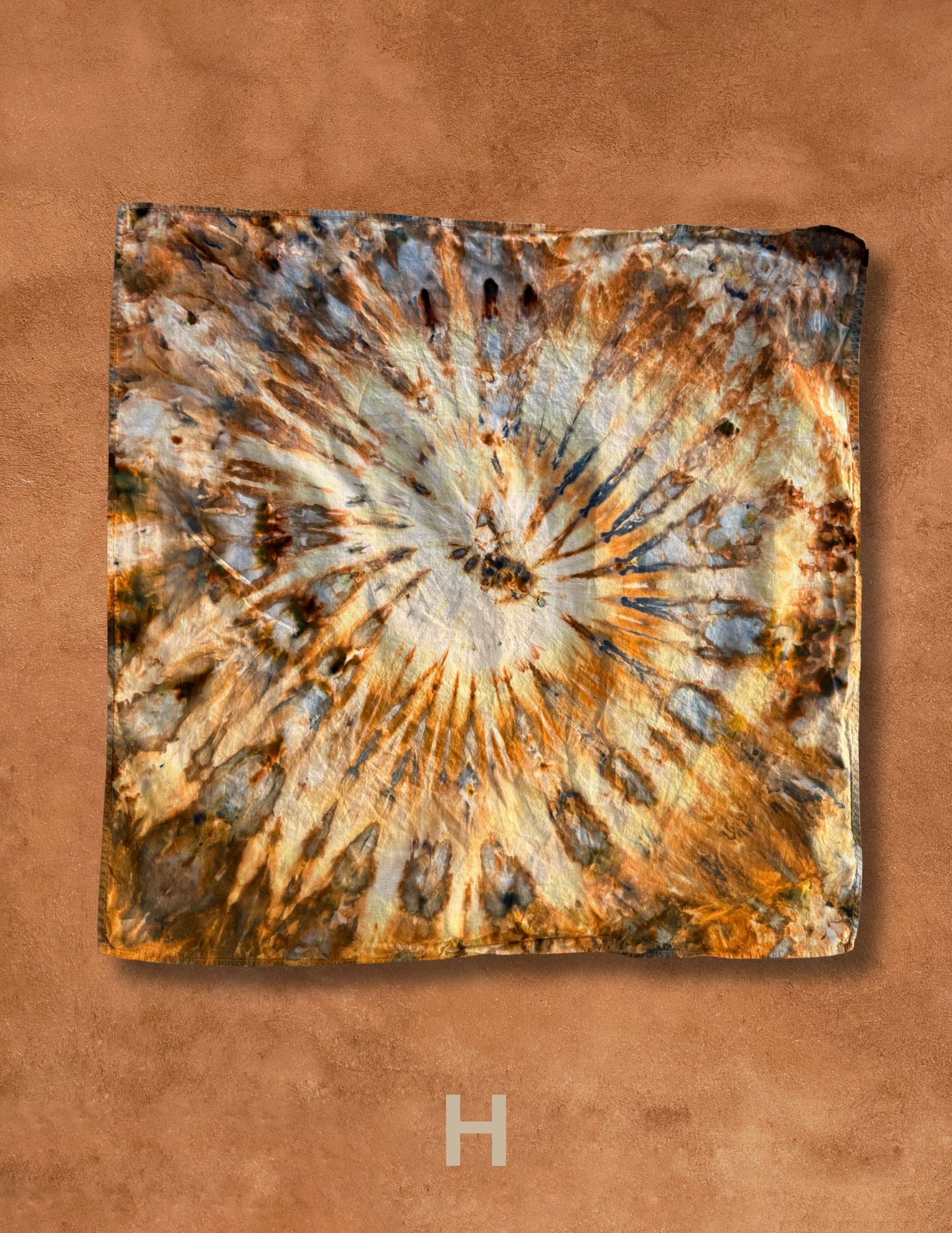 Each bandana is hand-dyed one at a time, capturing the warmth of ochre leaves and the shifting light of the desert. Made from 100% organic cotton, these wearable artworks are created here in Santa Fe, New Mexico, using slow, intentional dyeing methods that honor the land and process.