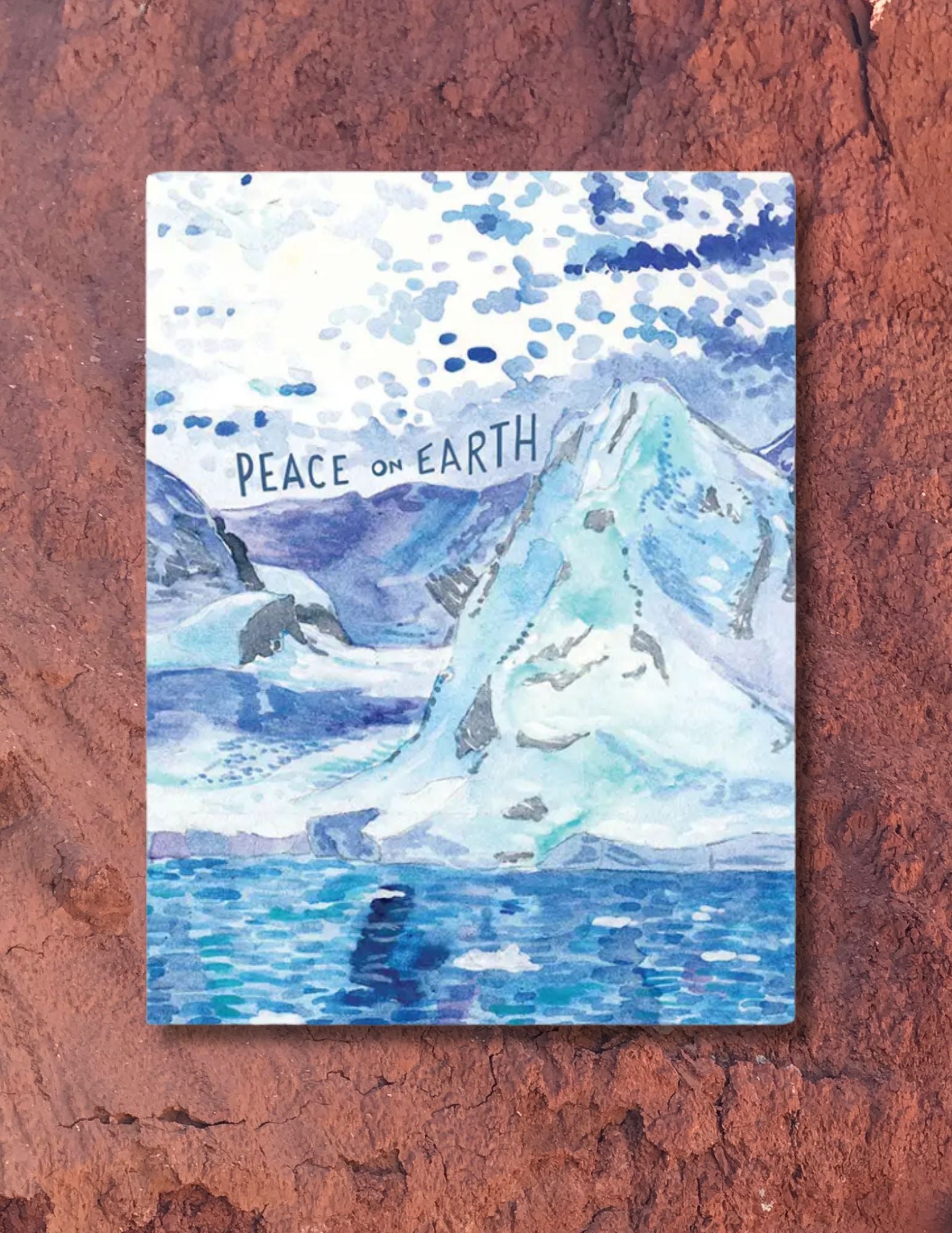 Celebrate hope and peace with our beautiful watercolor holiday card. Your customers will be enchanted by the stunning illustration of Antarctica and the hand-lettered message that reads "Peace on Earth." The artwork gracefully wraps around the card, revealing more of the breathtaking Antarctic landscape on the back. Inside, the card is blank, perfect for personalized messages. This unique piece is illustrated and hand-lettered by Seattle artist Brigida Swanson, inspired by her mother's photographs from a trip to Antarctica.