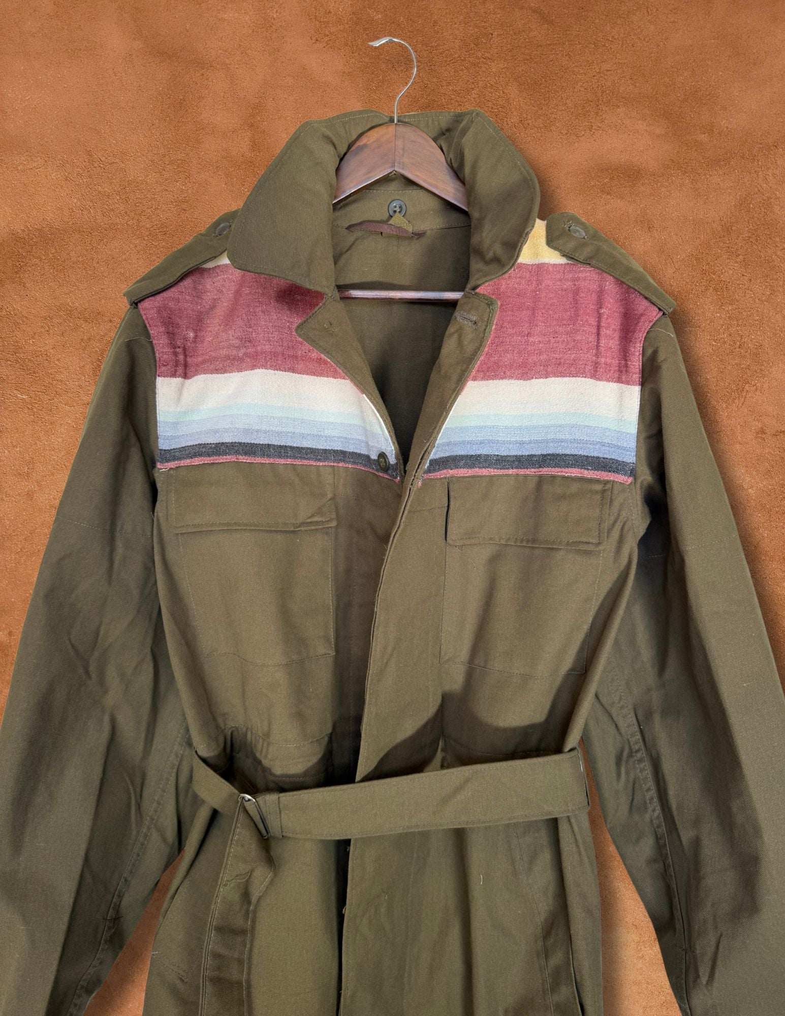 A classic reimagined — this one-of-a-kind military field jacket has been revived with midcentury wool blanket detailing, bringing warmth, texture, and heritage craftsmanship to utilitarian design.