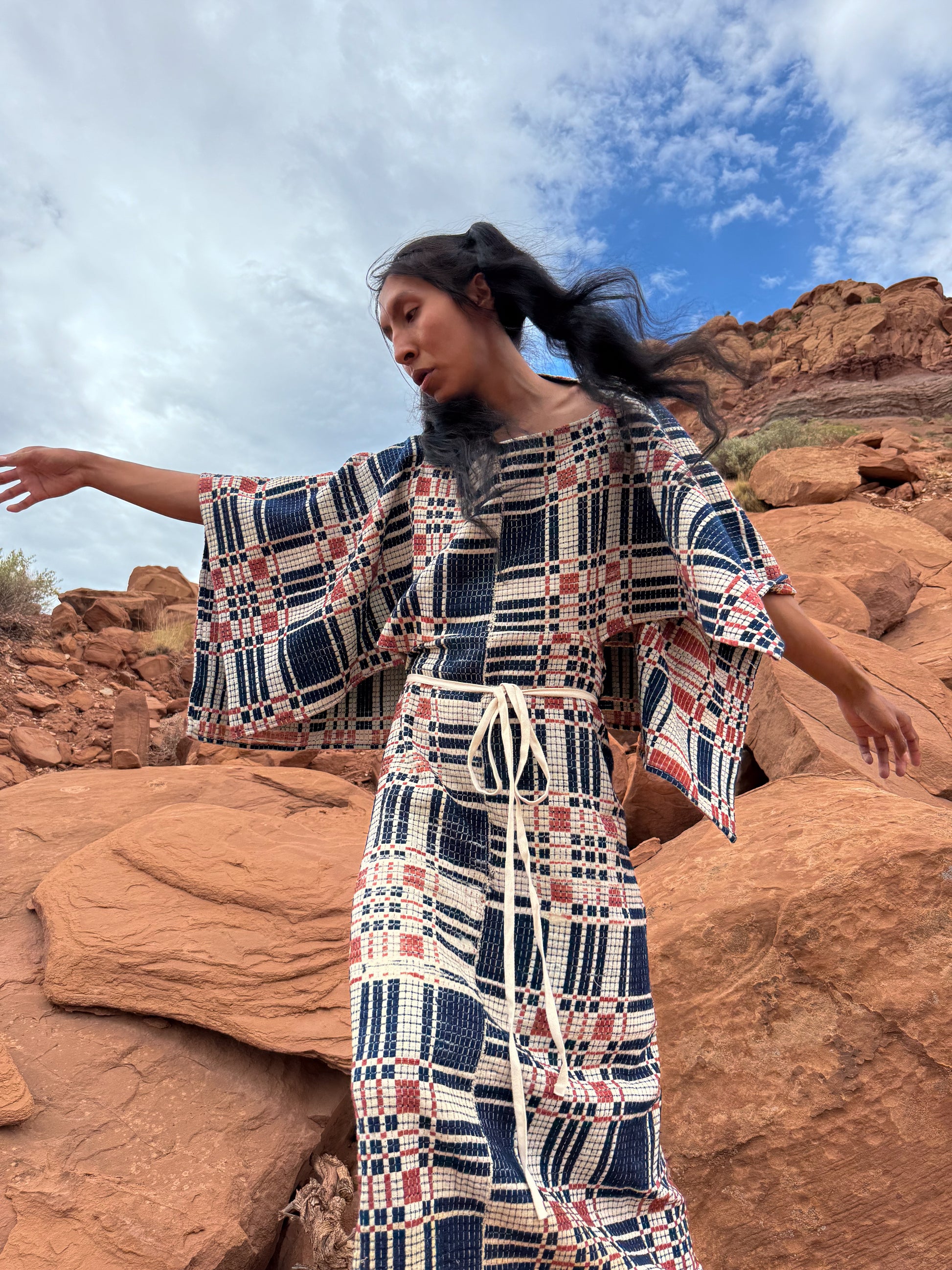 Dramatic sleeves, a wrap-tie waist, and fluid drape make this piece endlessly versatile — layered or worn on its own. The woven texture carries a century of human touch, finished by hand in our New Mexico studio.