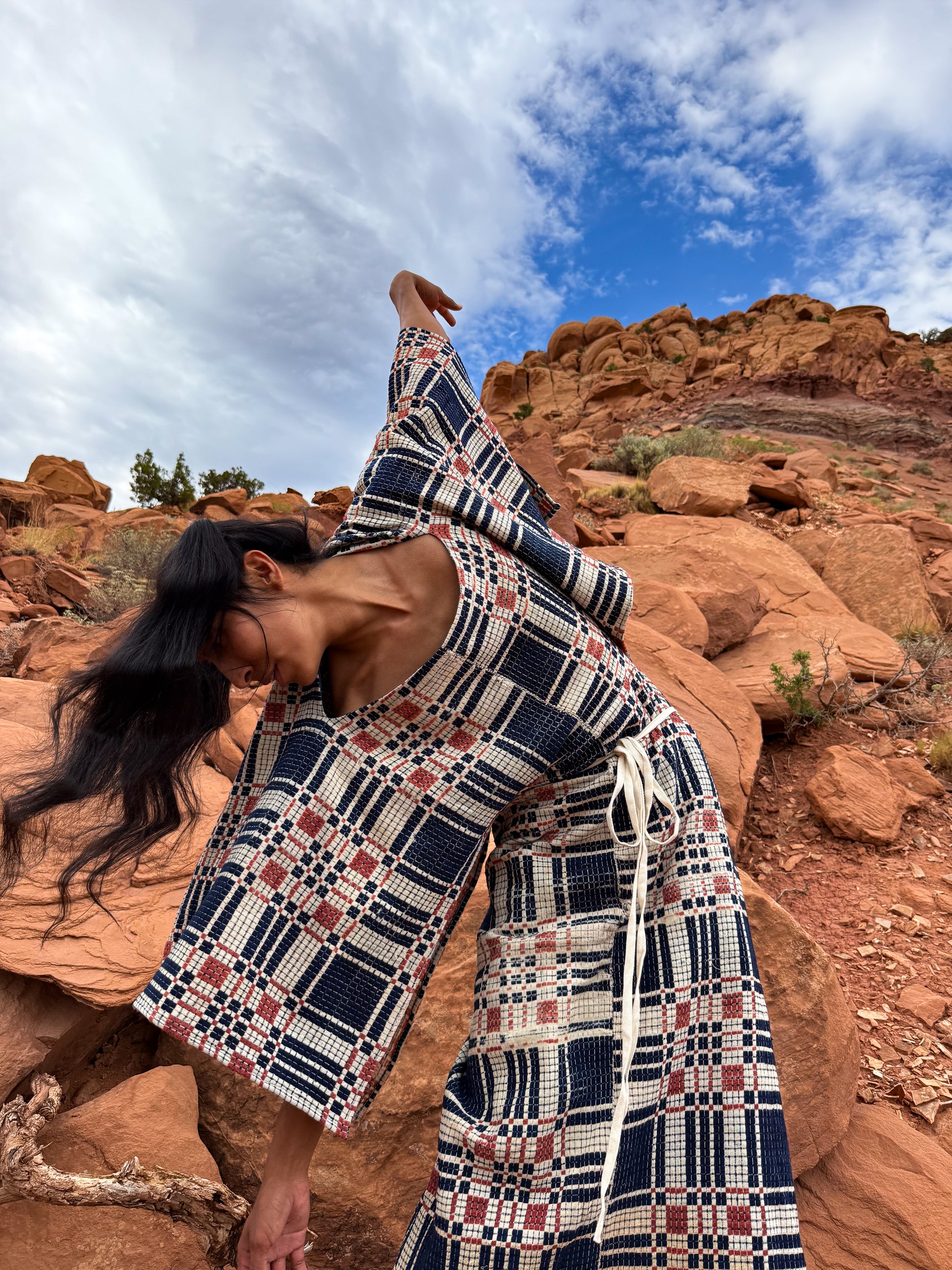 Reimagined into a modern silhouette, this garment honors the lineage of American craft while celebrating sustainability and Indigenous design through re-use and renewal.