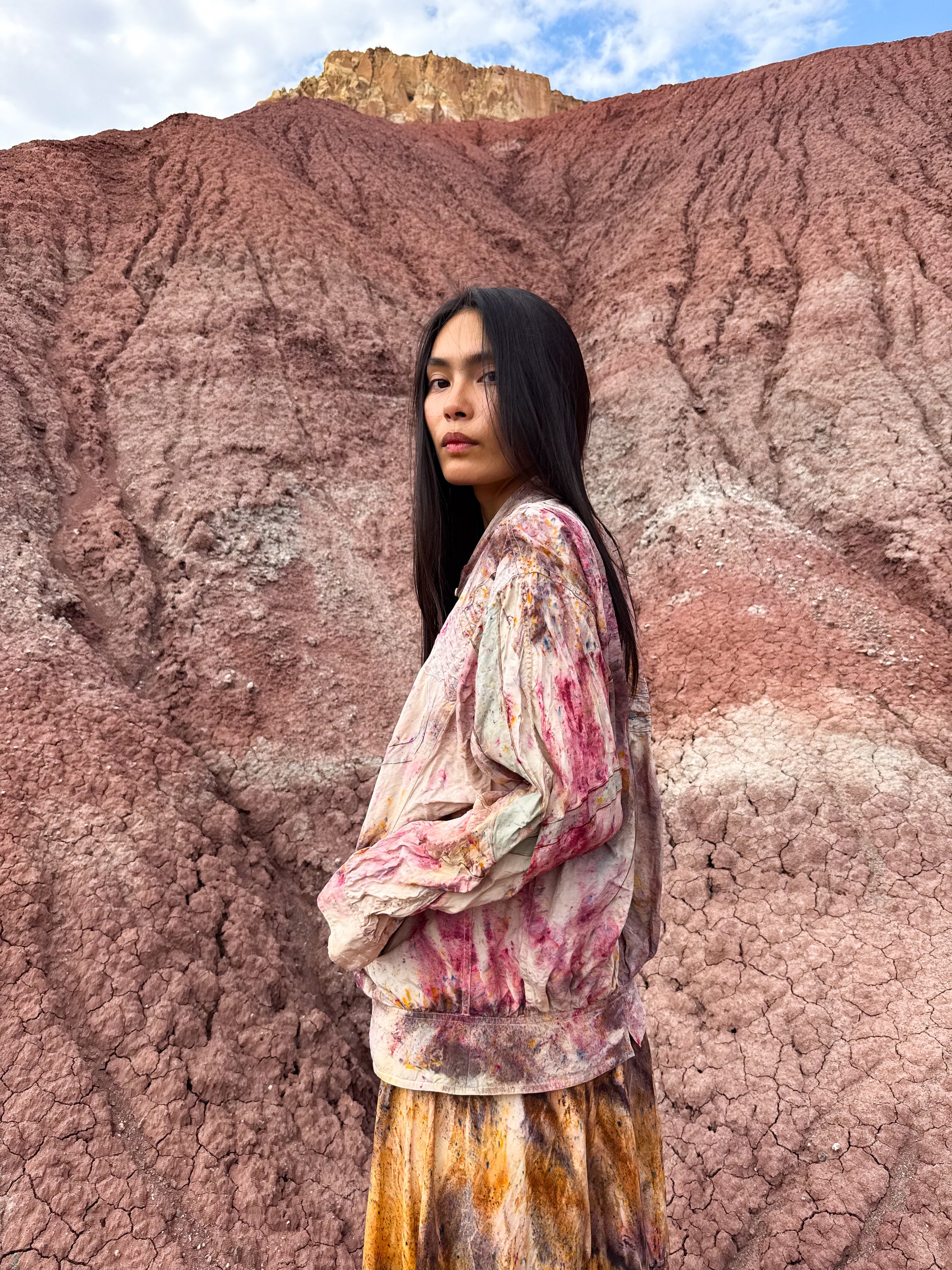 This vintage 1980s silk appliqué jacket carries the marks of time and transformation — a wearable artwork reborn through our upcycle dye process. Soft, fluid silk is splattered and layered in tones of magenta, clay, violet, evoking desert blooms and canyon light after rain.