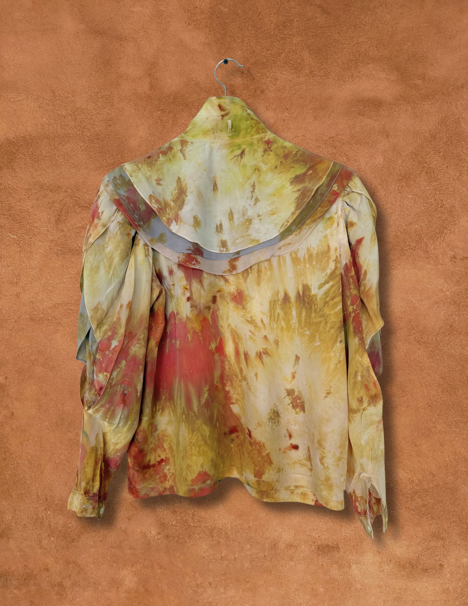 This vintage 1980s silk blouse has been hand-dyed in luminous tones of sunset gold, ember red, and mesa clay, echoing the colors of the desert at dusk. The bold, painterly dyework transforms the garment’s structured yoke and sculpted sleeves into a fluid interplay of light and landscape.