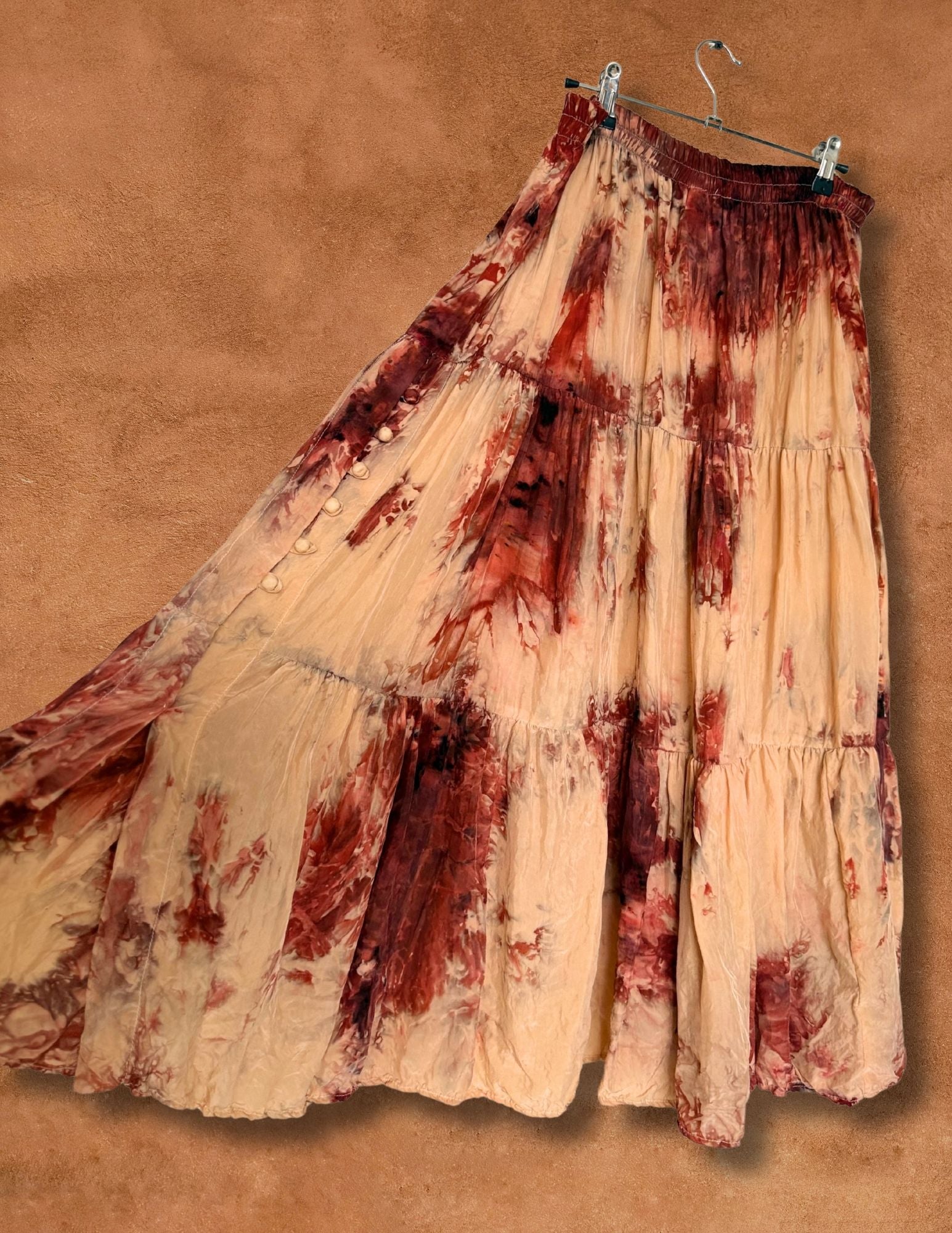 Hand-dyed in warm desert hues, this 1980s tiered skirt blends vintage romance with grounded modernity. Its voluminous silhouette moves like wind through canyon light, with rich tones of clay and garnet revealing the beauty of imperfection and transformation.