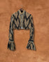 The bold Southwest pattern channels the high desert mesa — a rhythm of sandstone, sand gold, and onyx tones woven in striking contrast. Finished with romantic ruffled cuffs and a raw cropped hem, it’s a statement of movement, independence, and rebirth.