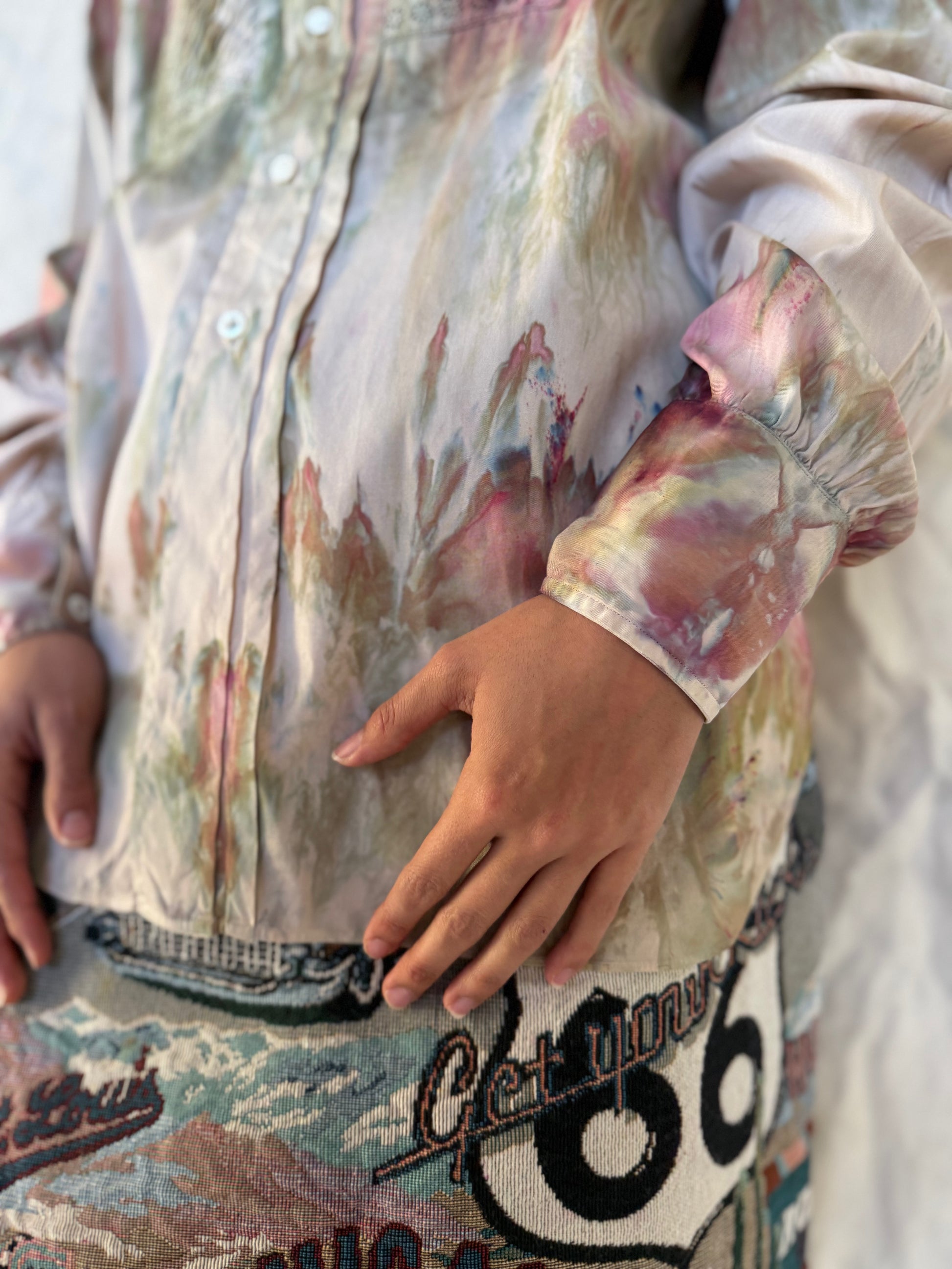 This vintage cotton shirt — originally sourced from a Hollywood costume liquidation — features intricate pleating, lace eyelet panels, and luminous pearl buttons. Each piece is hand-dyed in our New Mexico studio using a painterly process inspired by the desert in bloom — where sage, clay, and wild rose meet under changing light.