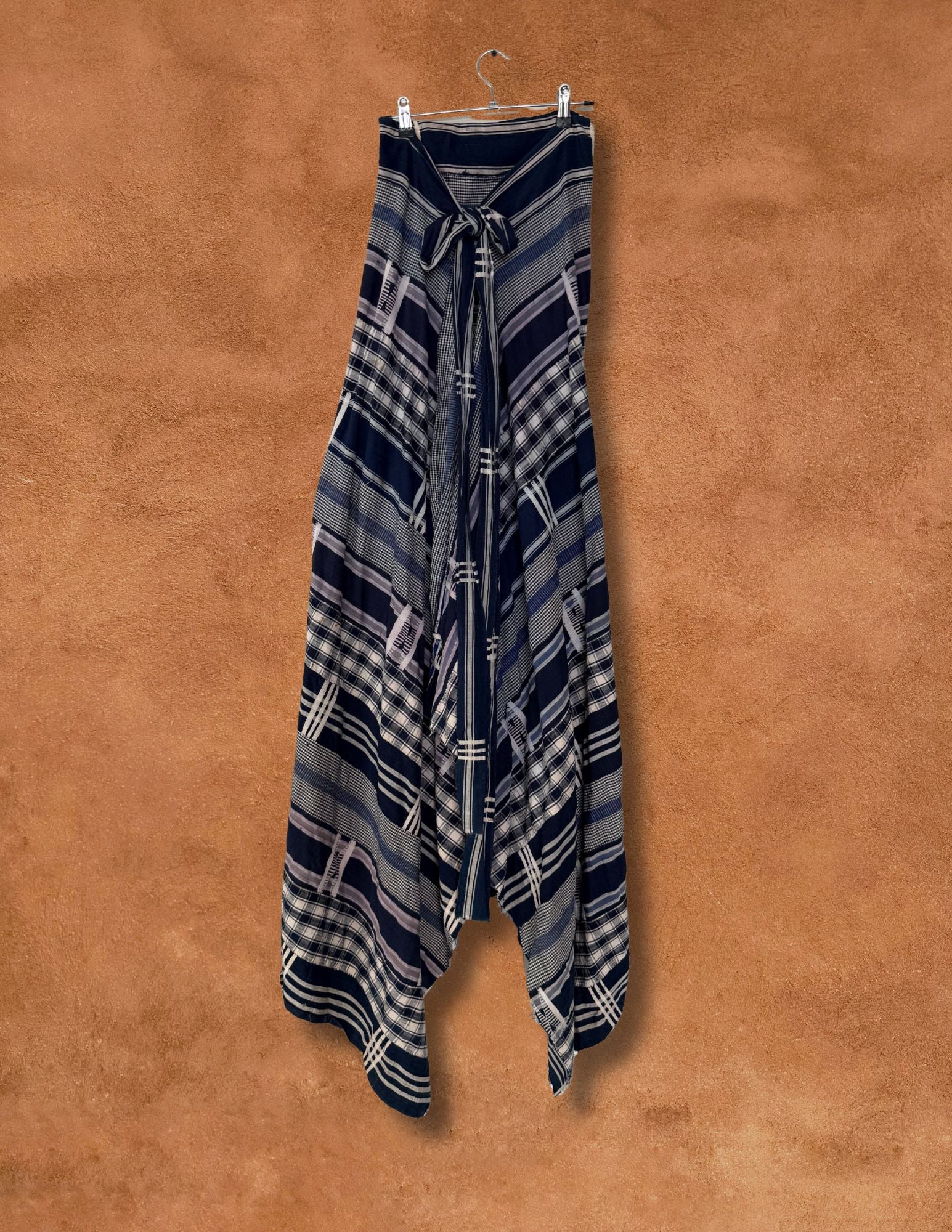 This garment is upcycled from authentic vintage Kente cloth, originating with the Ashanti and Ewe peoples of Ghana and Togo — woven on narrow strip looms and hand-joined in the traditional method. The skirt reimagines this traditional textile into a modern, high-waisted silhouette with an adjustable tie-back waist and cascading back hem — moving fluidly between heritage and contemporary form.