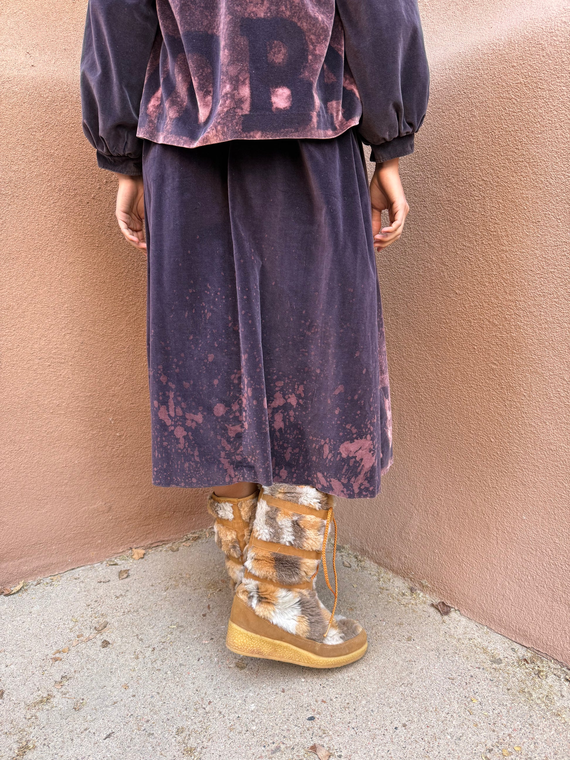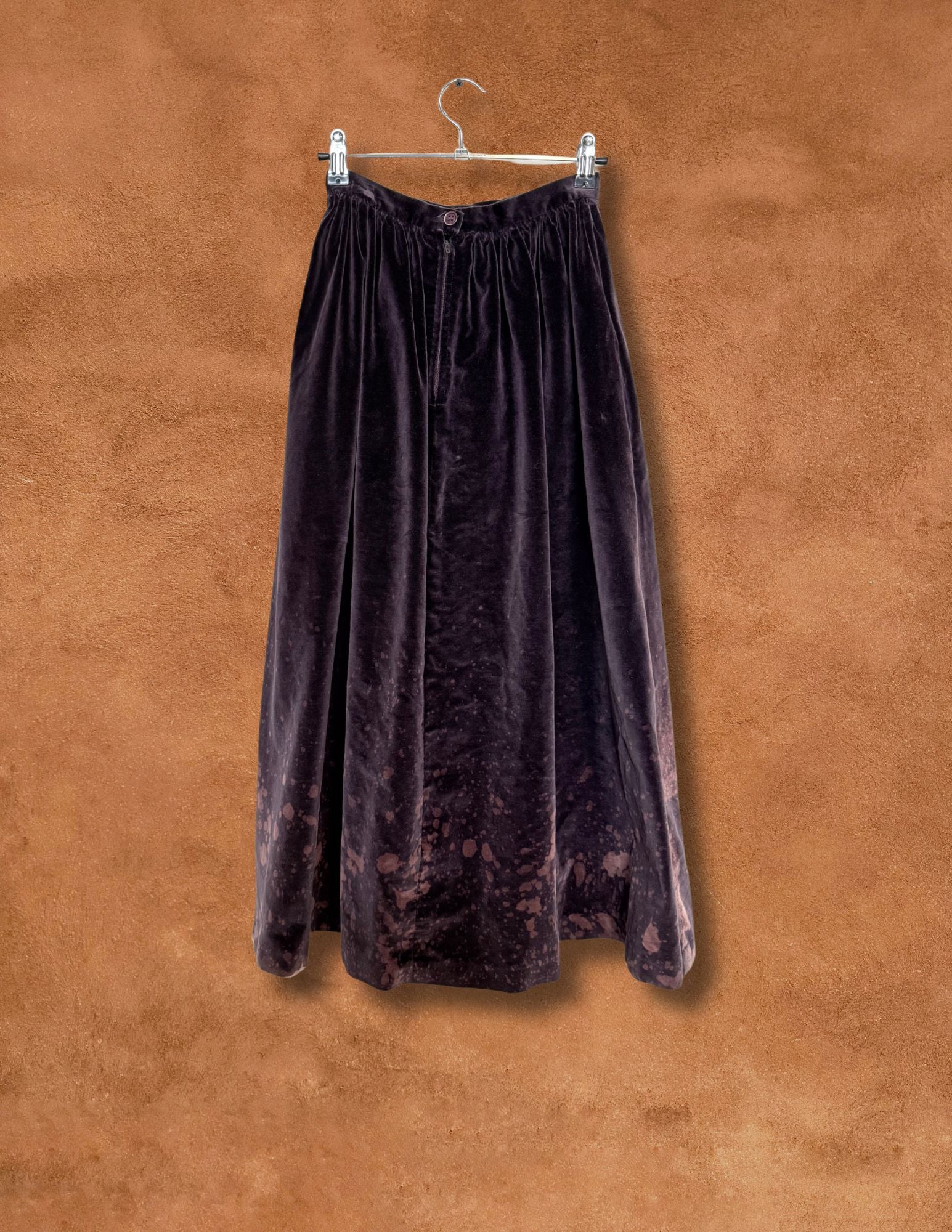 A lush velveteen vintage skirt, reverse-dyed by hand to reveal a subtle but powerful LAND BACK statement along the hem. V-yoke construction with beautiful drape and full skirting.
