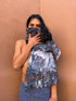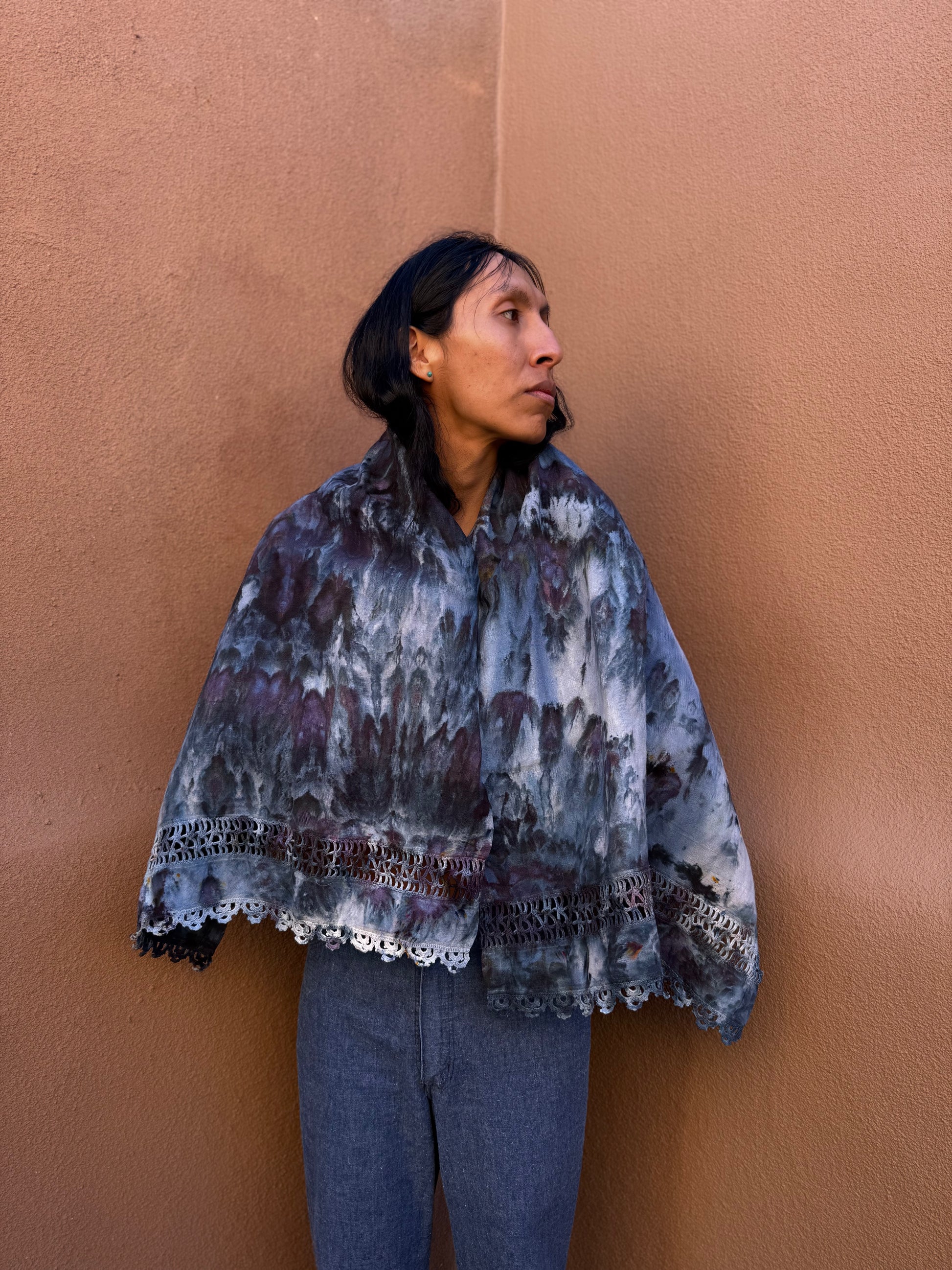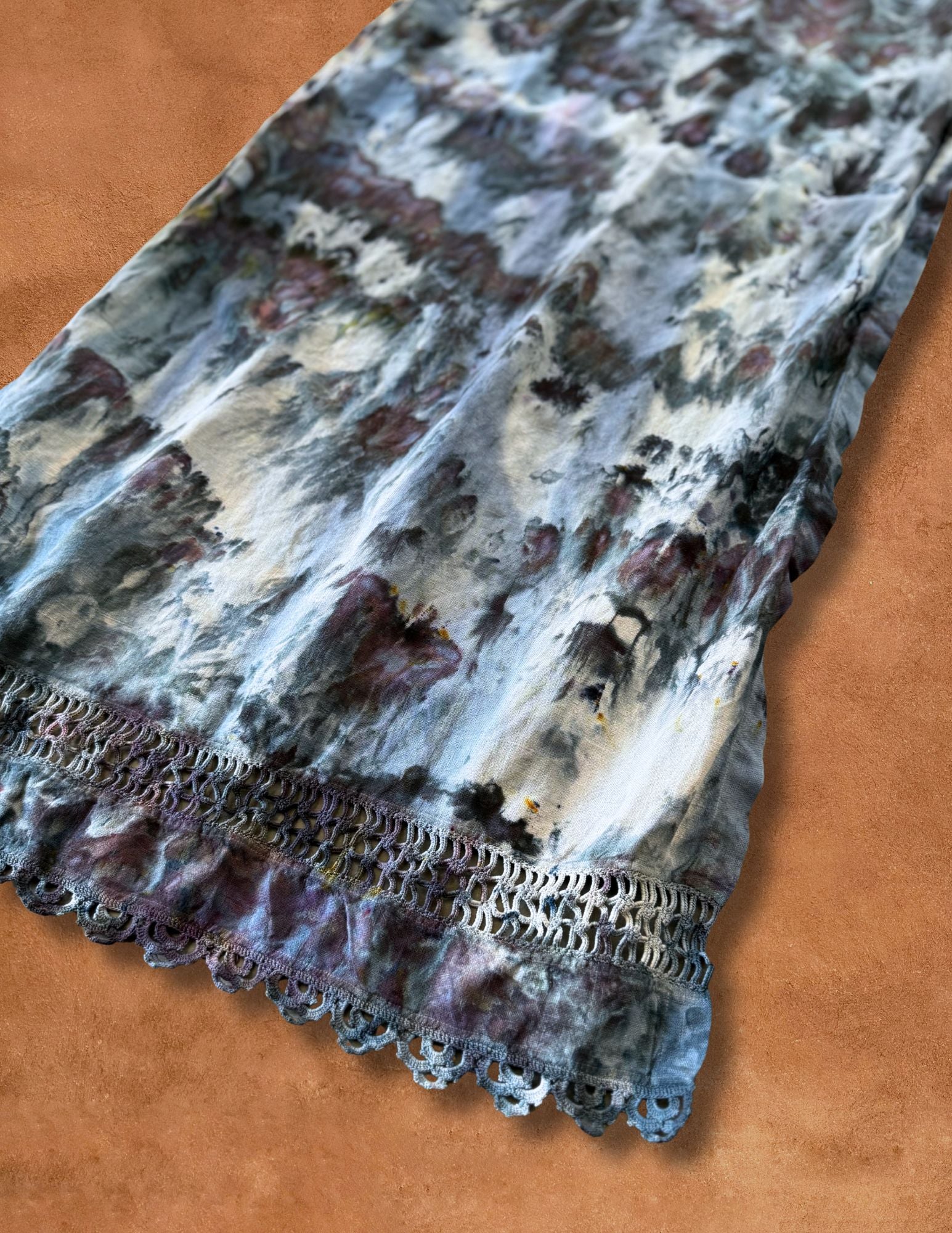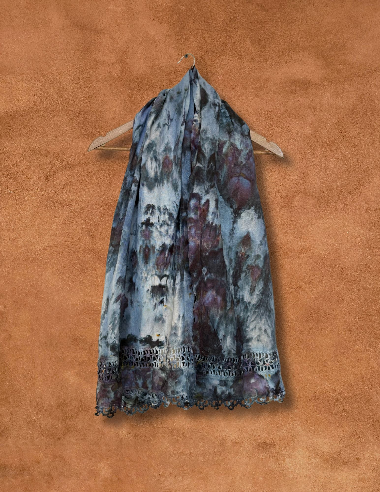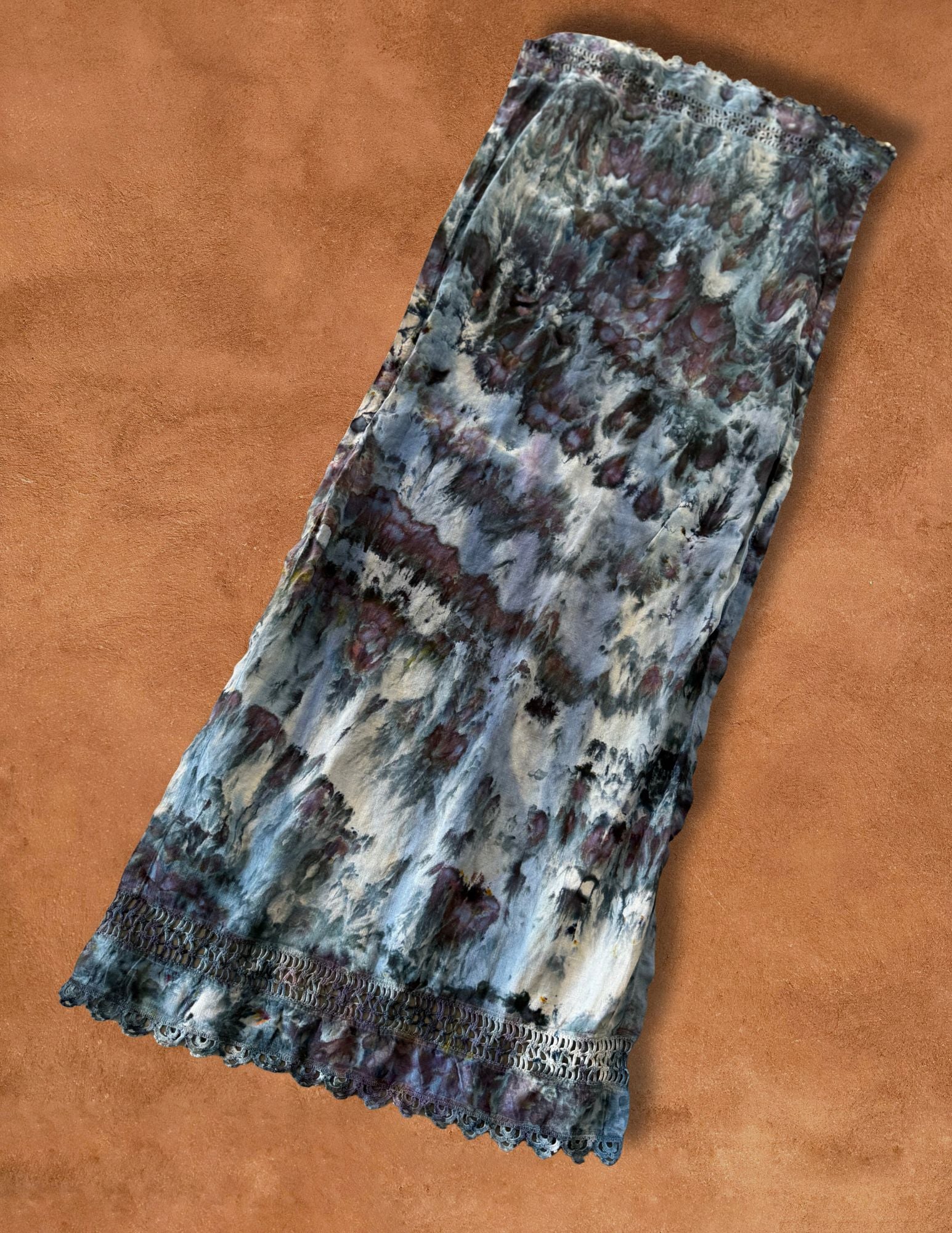 Versatile, and one-of-a-kind — this hand-dyed vintage linen textile can be styled as a flowing scarf or used as a statement table linen. Its shifting hues of indigo, violet, and charcoal evoke desert storm skies , each piece uniquely patterned through our small-batch dye process.