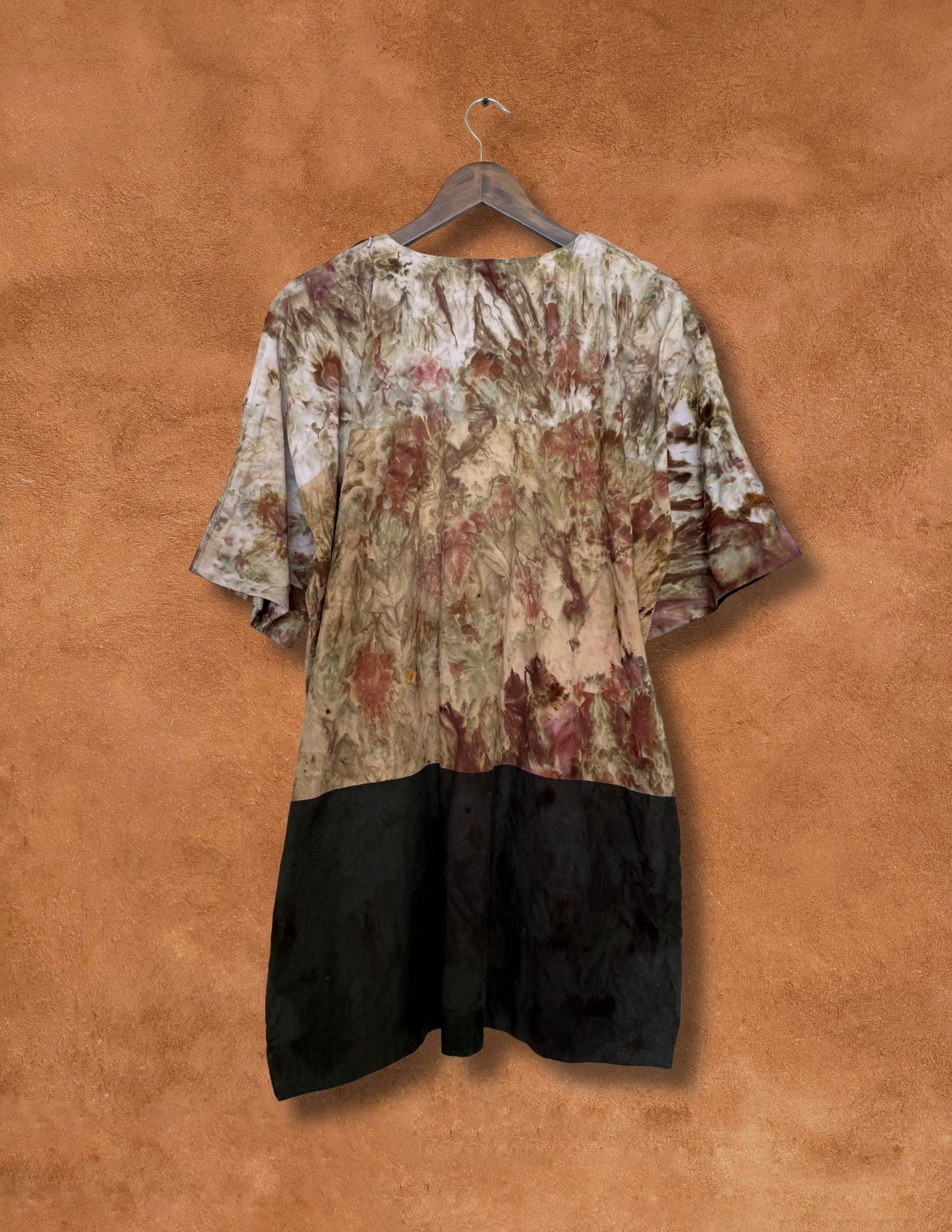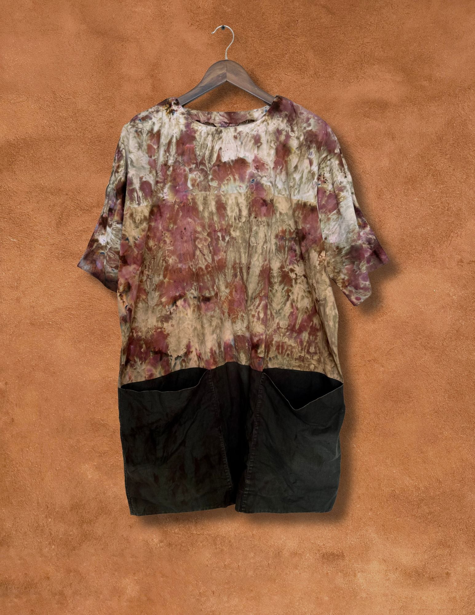 Originally a vintage midcentury Marimekko tunic, this piece has been transformed through our hand-dye process under New Mexico skies — a meeting of Nordic minimalism and organic earth tones. The result is a one-of-a-kind wearable artwork where soft plum, clay, and sage hues flow into a deep, grounded black hem.