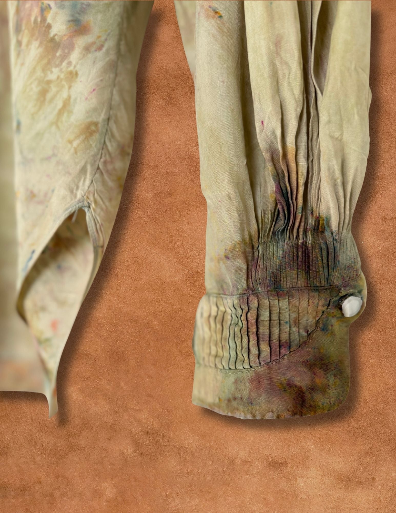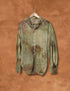 A relic of refined craftsmanship, reawakened through natural process and hand-dye. This vintage midcentury eveningwear shirt, once formal, now lives in organic tones of moss, sage, and clay — soft gradients echoing aged silk and desert bloom.