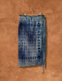 The textile is woven from indigo-dyed wool and natural cotton, hand-loomed in two narrow panels, then seamed and finished with a subtle hand-dye patina to celebrate its age and imperfection.
