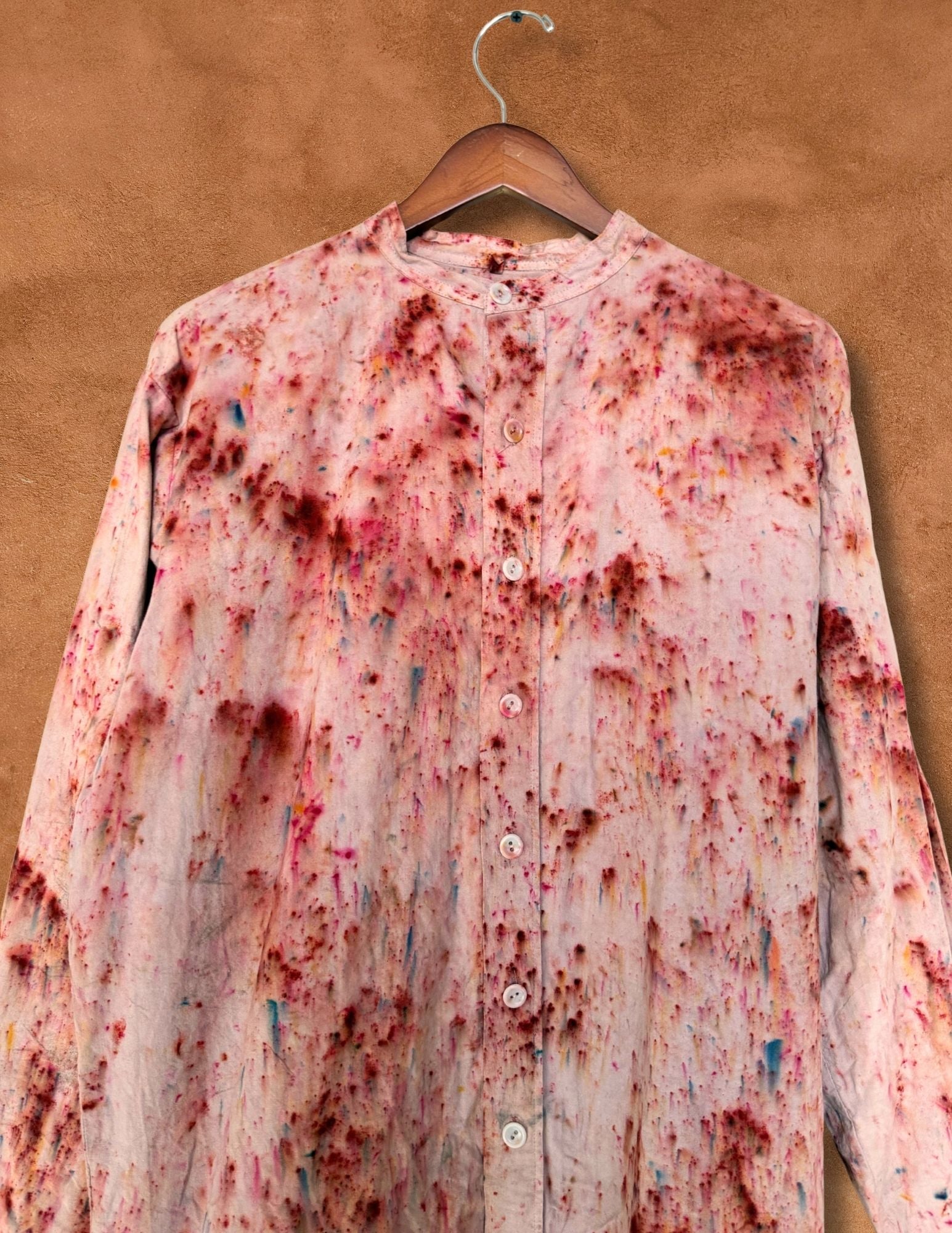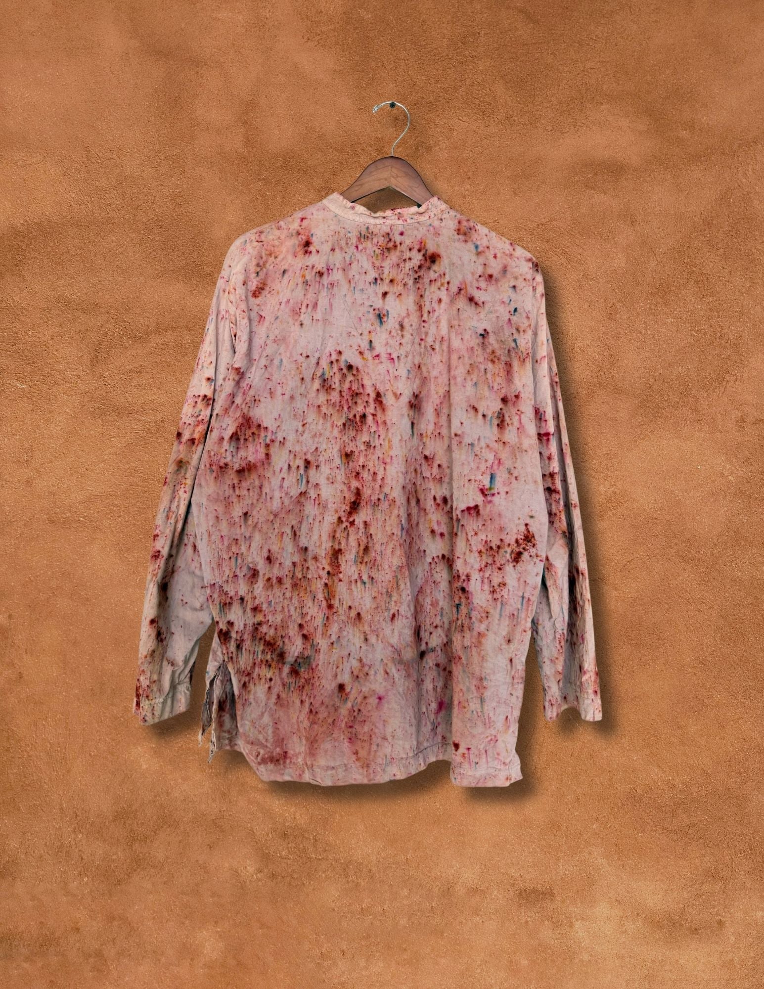 Hand-dyed in organic tones reminiscent of red sandstone and rain-washed clay, this upcycled midcentury shirt carries a palette shaped by land, time, and touch. Each mark is unrepeatable — a map of process and transformation that makes every piece singular.