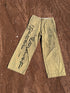 Hand-painted calligraphy by Diné (Navajo) artist Blythe Marino transforms these pants into wearable art. Marino is a talented artist who blends contemporary calligraphy with themes that honor Indigenous culture. This piece carries her signature messages of wisdom and resistance: Honor the Sacred