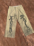 Hand-painted calligraphy by Diné (Navajo) artist Blythe Marino transforms these pants into wearable art. Marino is a talented artist who blends contemporary calligraphy with themes that honor Indigenous culture. This piece carries her signature messages of wisdom and resistance: Land Back.