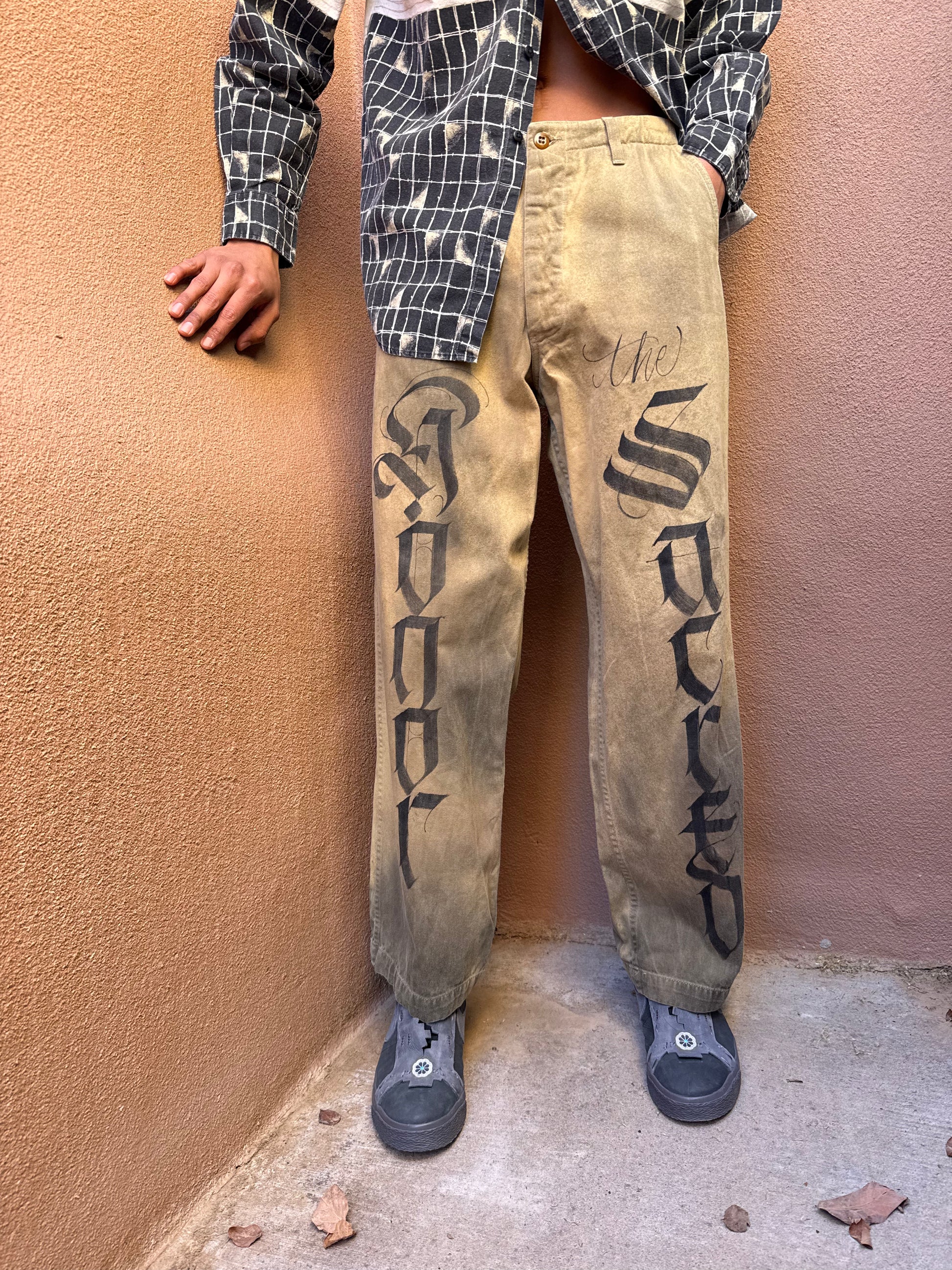 Hand-painted calligraphy by Diné (Navajo) artist Blythe Marino transforms these pants into wearable art. Marino is a talented artist who blends contemporary calligraphy with themes that honor Indigenous culture. This piece carries her signature messages of wisdom and resistance: Honor the Sacred.
