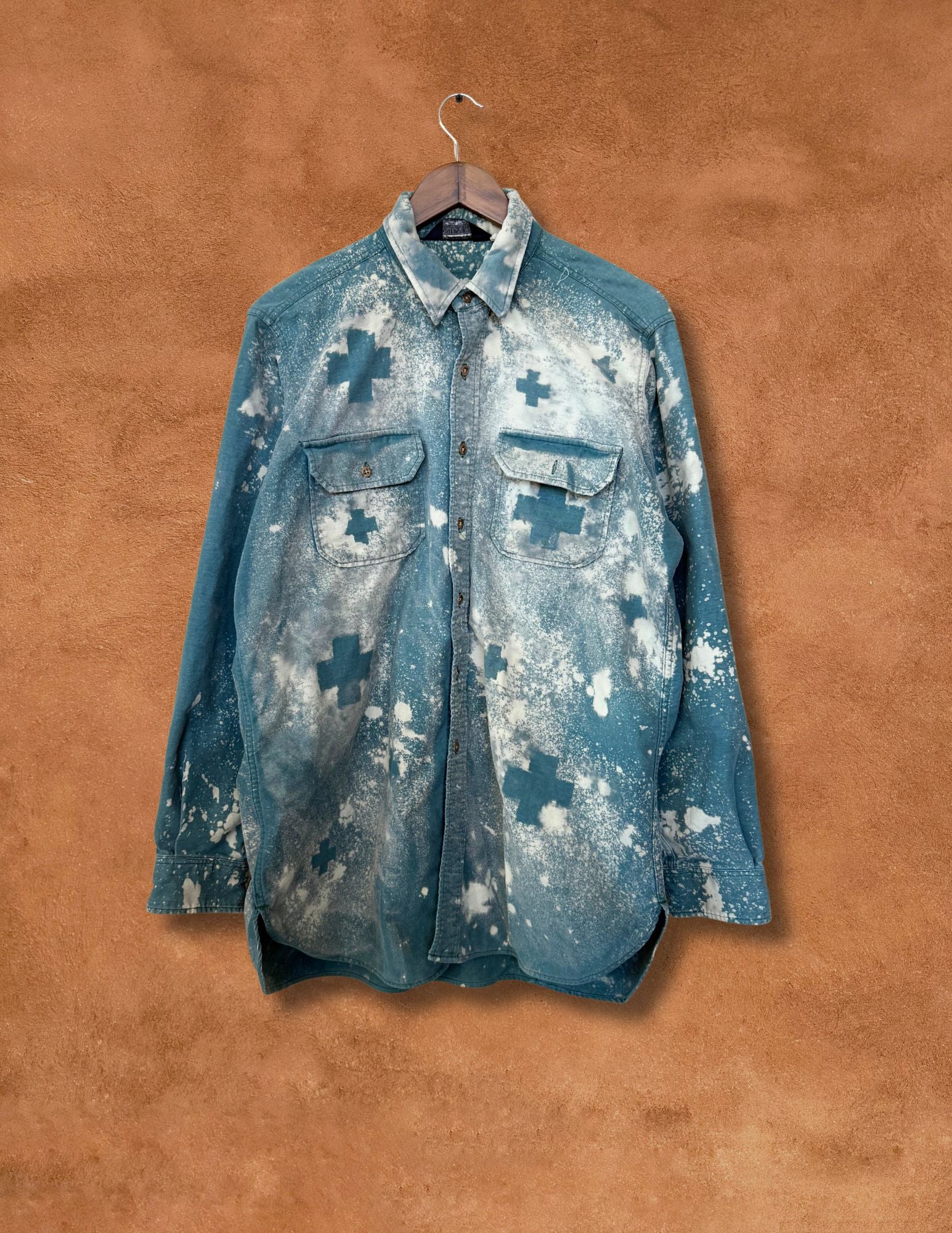 This vintage cotton moleskin jacket has been reverse-dyed in our Santa Fe studio, transforming a classic utilitarian piece into a one-of-a-kind winter essential. Each garment is crafted slowly, creatively, and with intention — honoring both the past and the process. Star pattern to reflect our earth and sky.