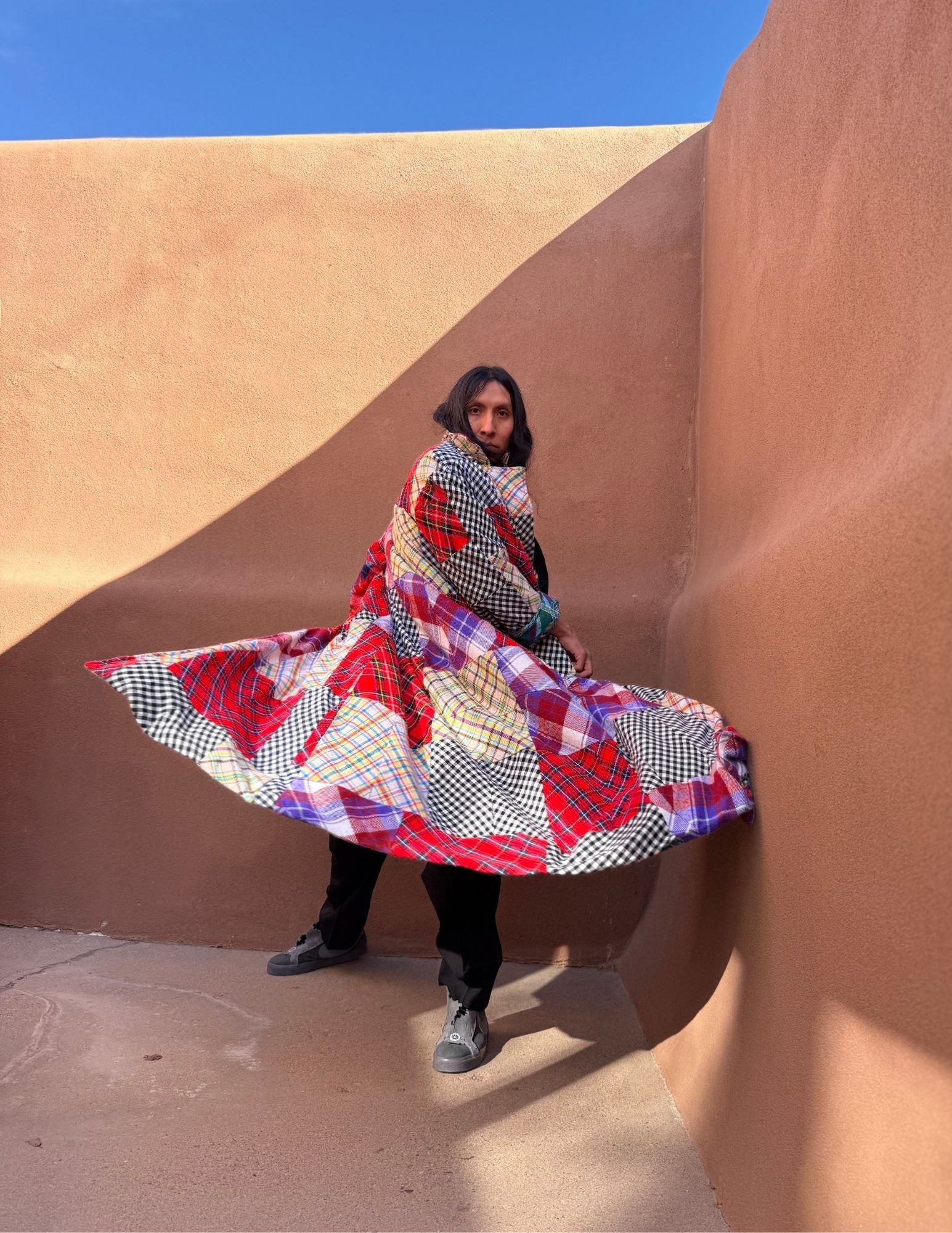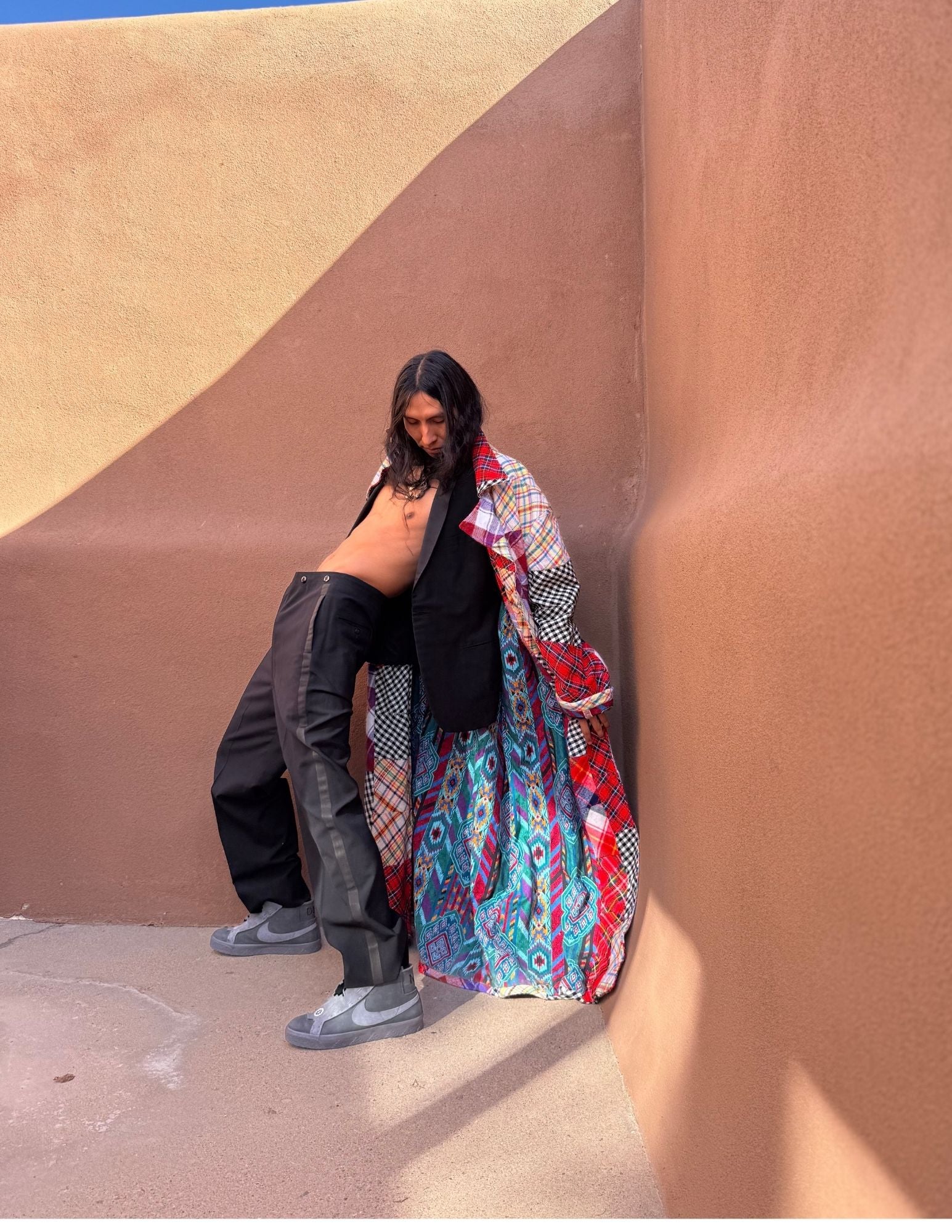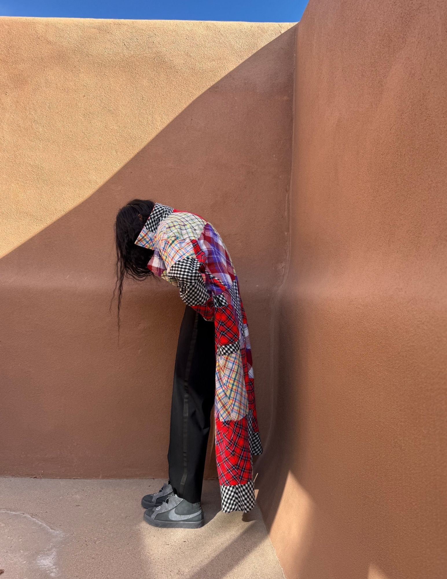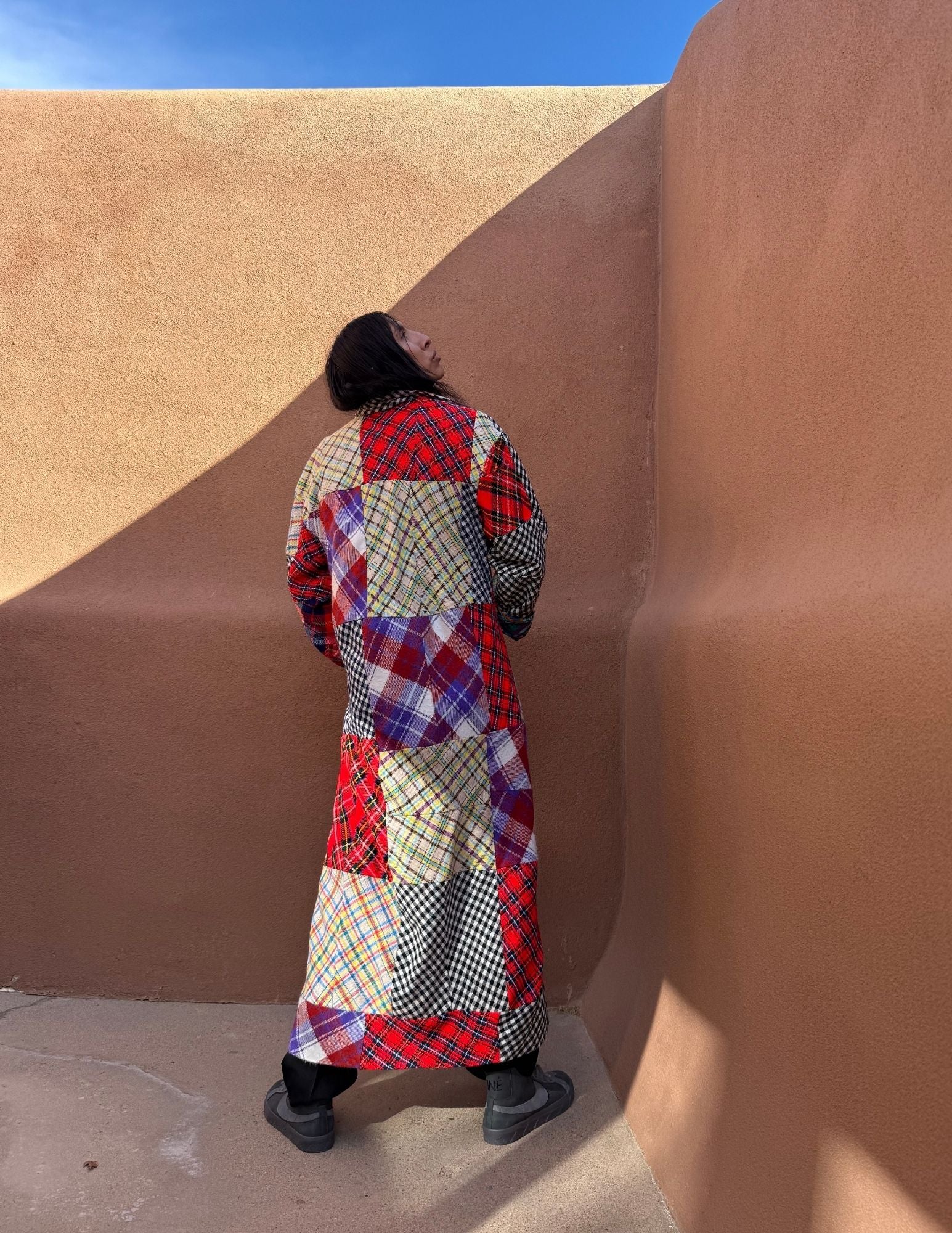 This one-of-a-kind maxi coat is upcycled from vintage patchwork plaids and designed to make an epic statement. Lined with Southwest deadstock cotton, it features two roomy front pockets and military-style button details down the front. A slouchy, oversized silhouette gives it an effortless, lived-in feel. No label, feels like wool blend.