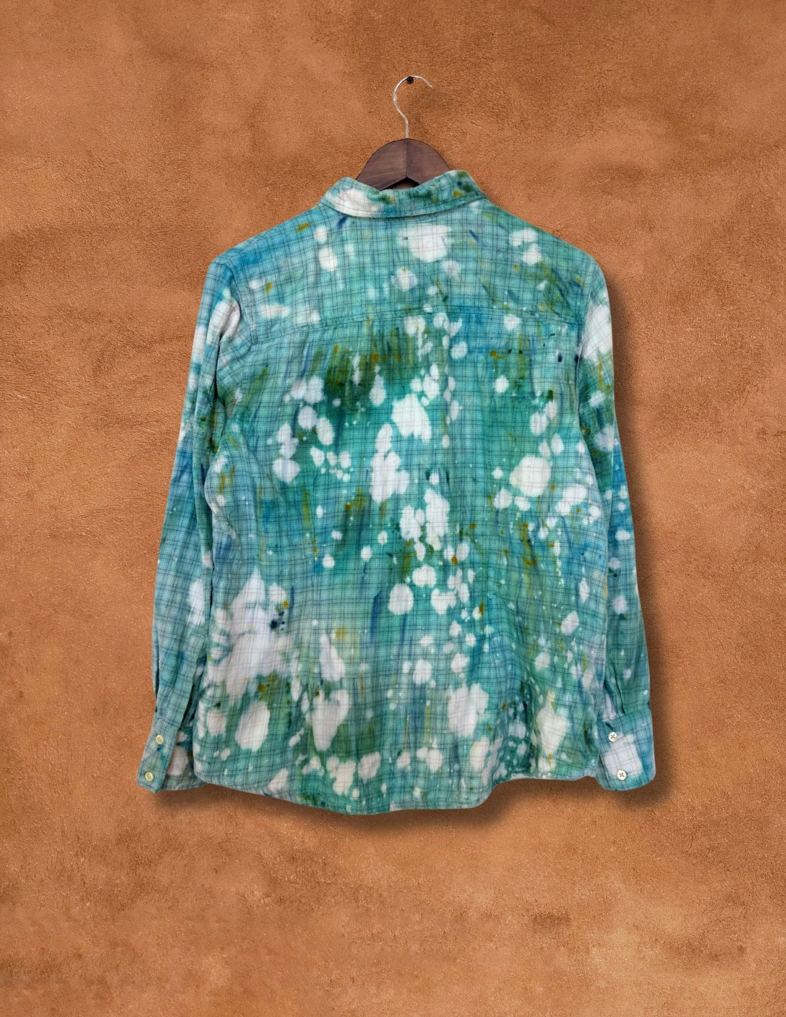 Made from 100% cotton flannel, aged to perfection, and lovingly recolorized under the blue skies of New Mexico at our Santa Fe studio. Button Front and cuff, front chest darts, boxy fit. Shade of clouds dancing in the sky.