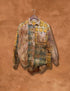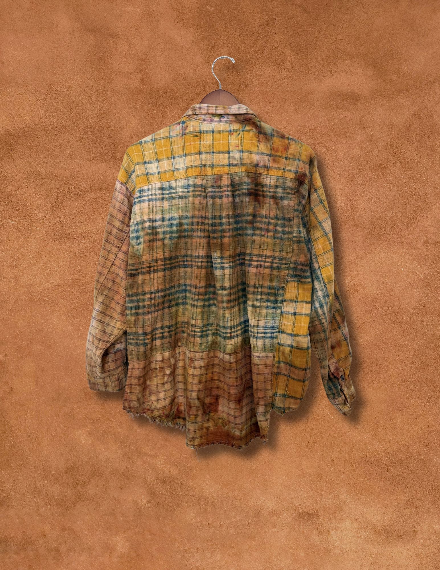 This limited-edition patchwork flannel has been reverse dyed and overdyed in our Santa Fe studio, finished in a warm ochre wash that echoes high desert light at golden hour. Each panel carries its own tone and texture, with raw edging at the hem for a lived-in, perfectly imperfect finish.