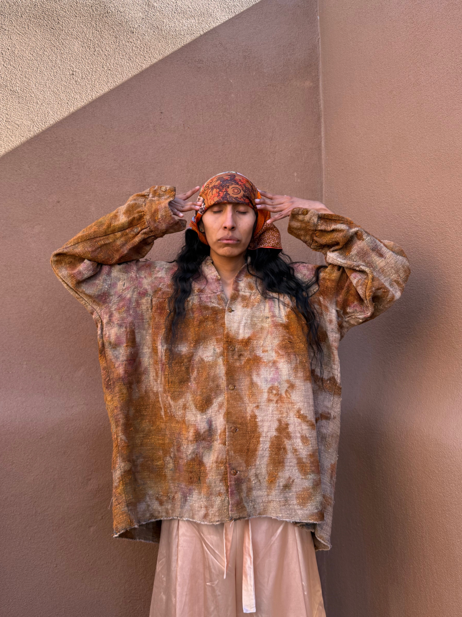 An elevated take on classic tailoring — this vintage raw silk shirt has been transformed through our hand-dye process inspired by the desert’s shifting light and earthen tones. Each piece carries its own organic marbling and depth of color, celebrating texture, imperfection, and renewal.