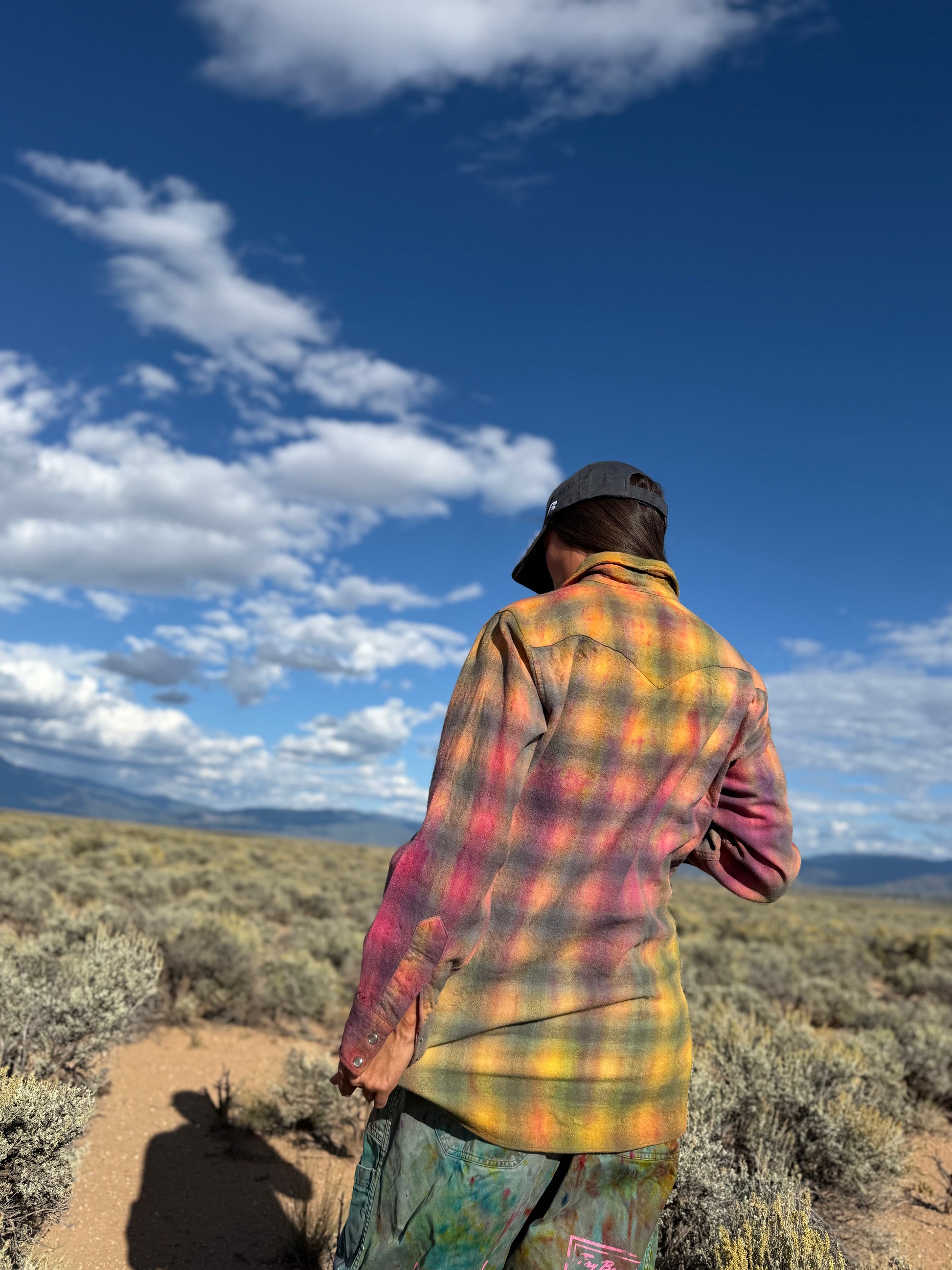 Lovingly recolorized under the big blue skies in our New Mexico dye studio. Dyed in the rich hues of a Southwest rainbow, this vintage workshirt is truly one of a kind. Crafted from 100% virgin wool, it features an pearl snap front design and cuffs, lined shaped cowboy yoke, and front pockets.
