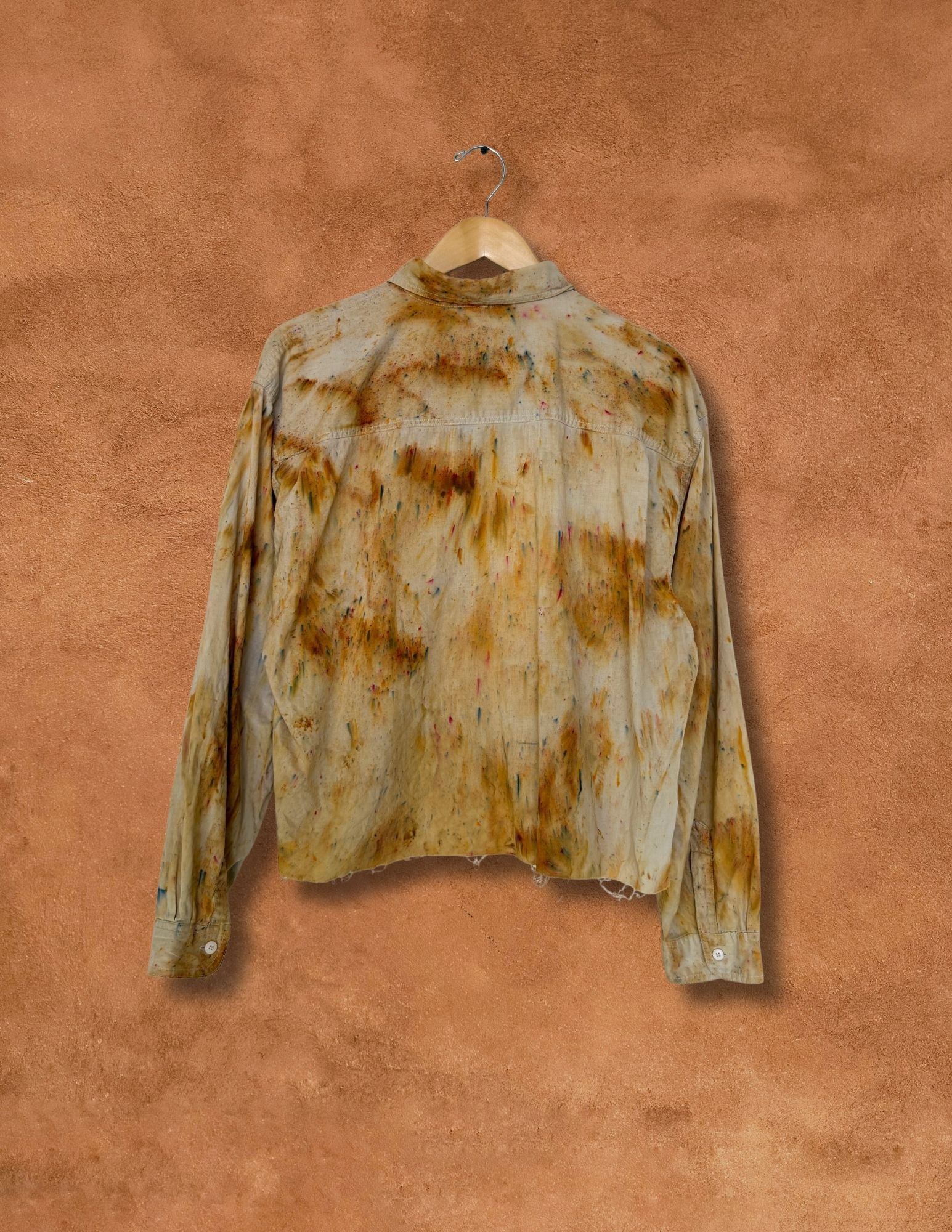 A lived-in canvas of history and craft. This upcycled vintage workwear shirt carries the marks of time — reimagined through a painterly dye process that brings warmth, texture, and life to its utilitarian roots. Each piece tells its own story through faded hues, subtle splatters, and hand-finished details.