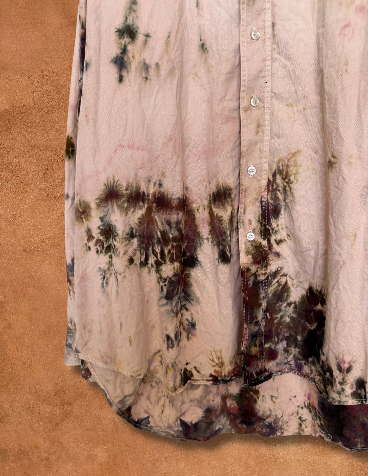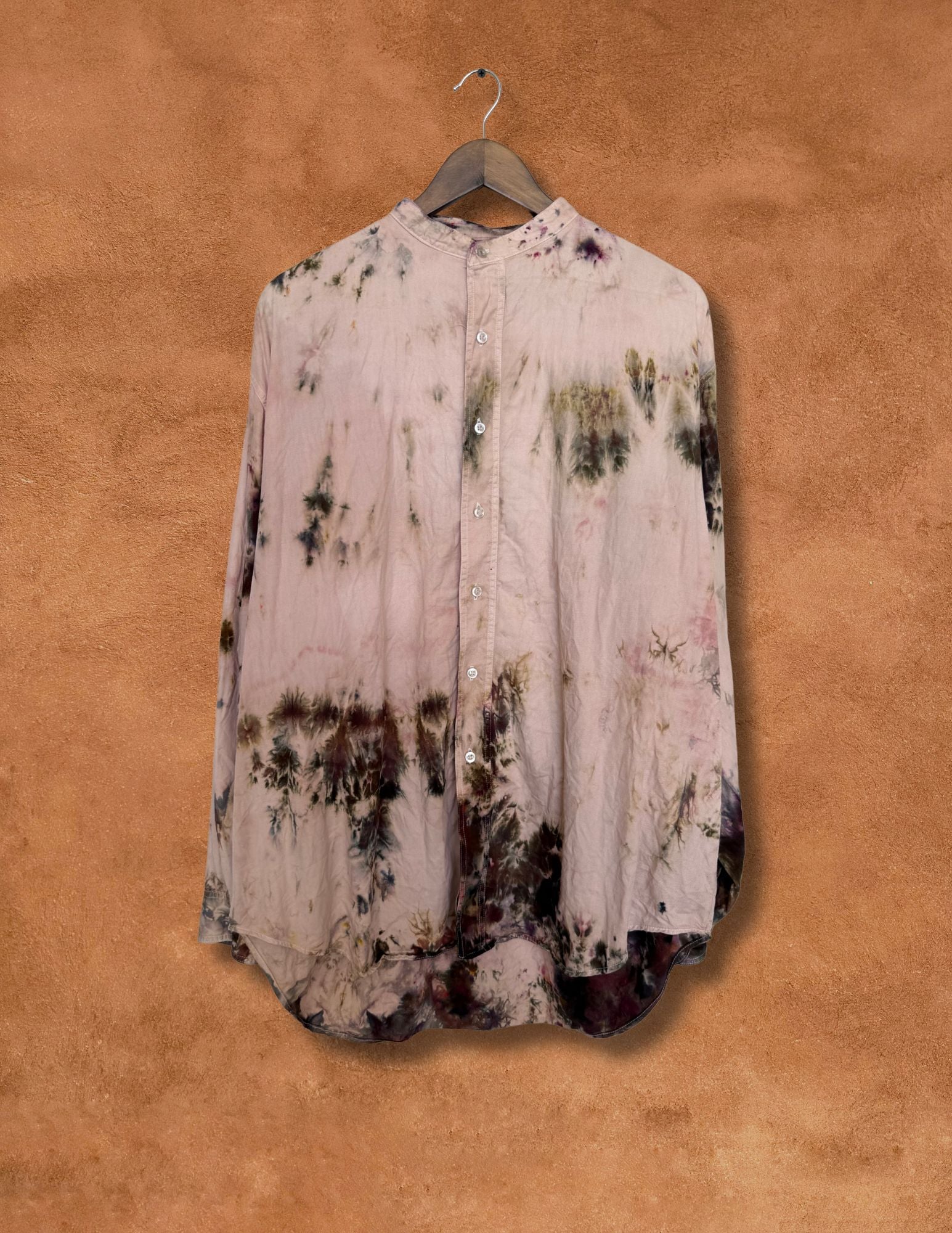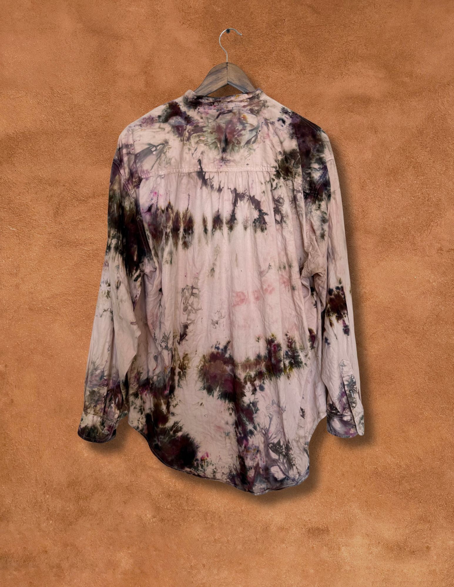 An evolution of the classic work shirt — stripped back to its essence and reborn through hand-dye alchemy under New Mexico skies. Each piece carries its own abstract patterning, soft drape, and lived-in artistry — a reflection of both history and transformation.