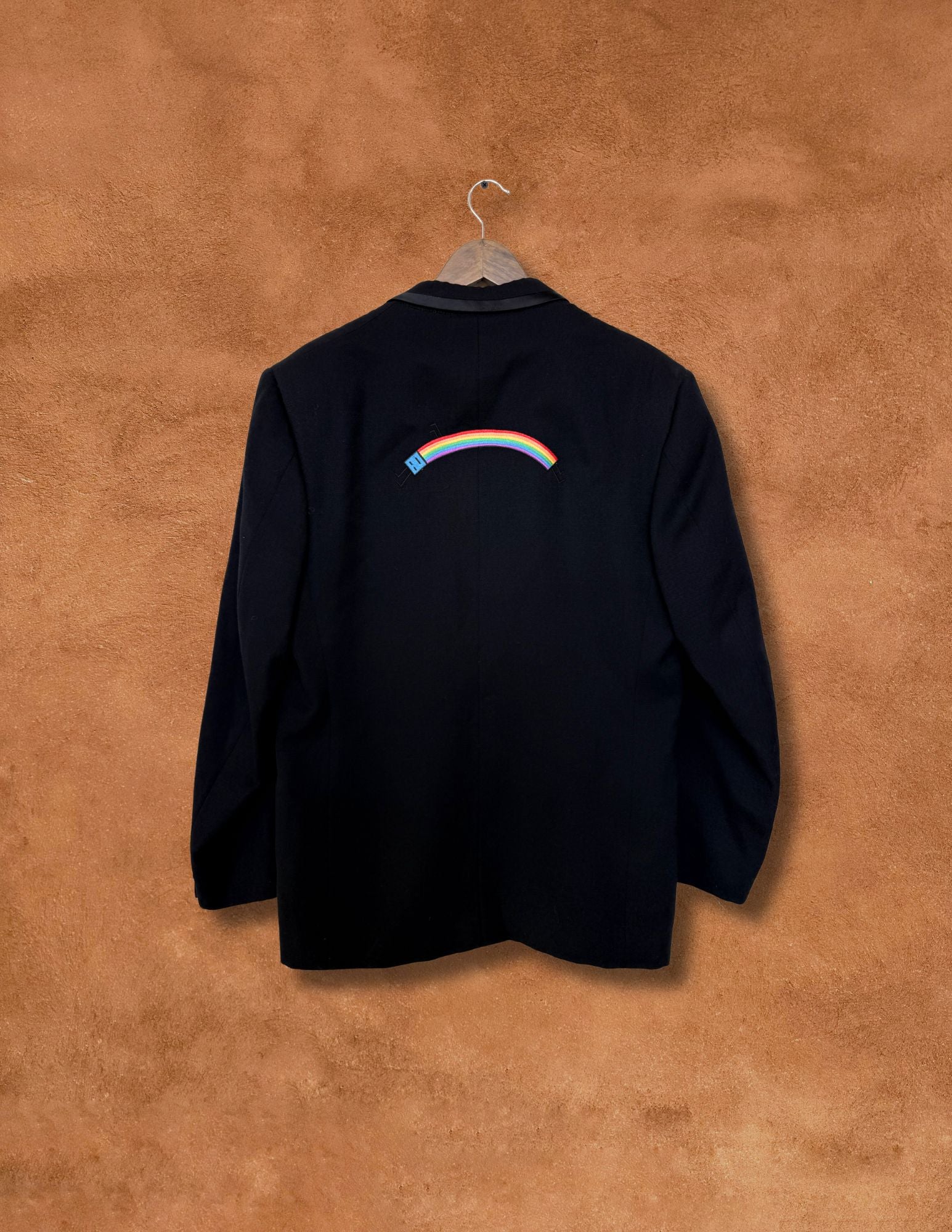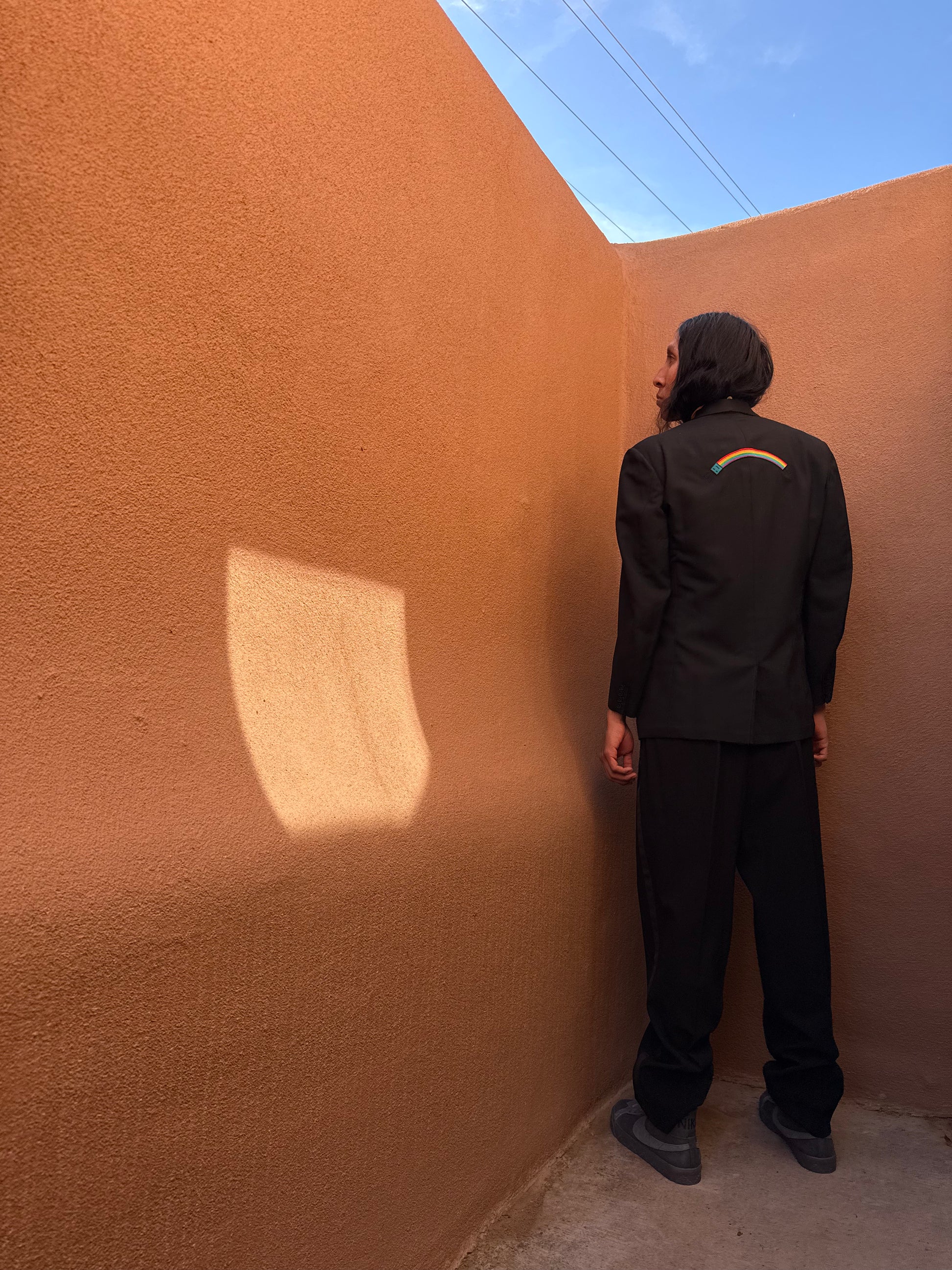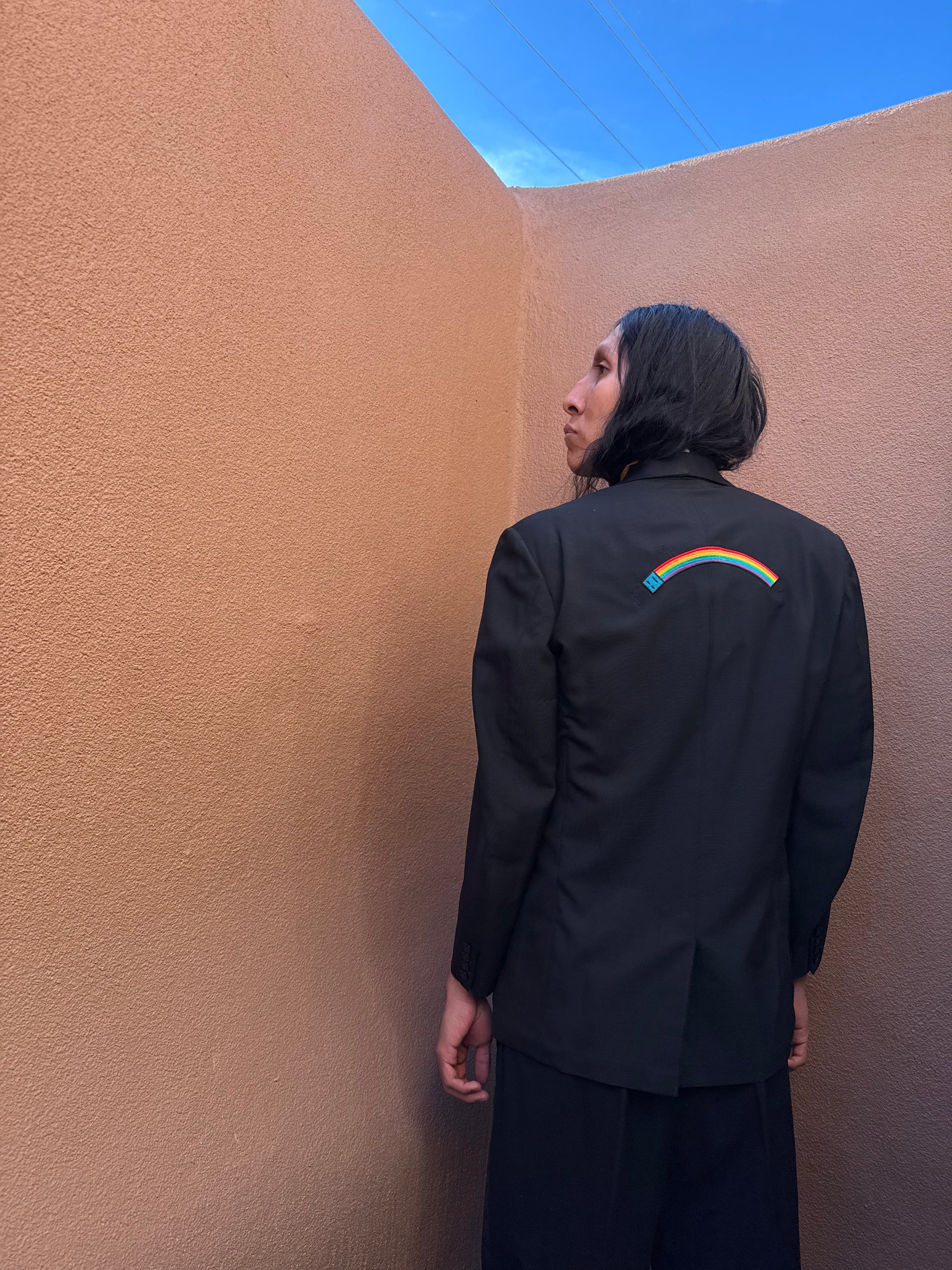 What transforms this piece into something extraordinary is the back — embroidered with Yeii’bí’cheíí Nástíí’liid (Rainbow Spirit). A powerful symbol the rainbow represents protection, balance, and the beauty of all our shared relatives.