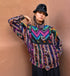 A radiant celebration of color and craft, this vintage handwoven Guatemalan jacket is a wearable mosaic of culture and geometry. Each panel is intricately woven from 100% cotton in rich jewel tones — turquoise, magenta, orange, and violet — forming chevron and ikat motifs that honor generations of textile artistry.