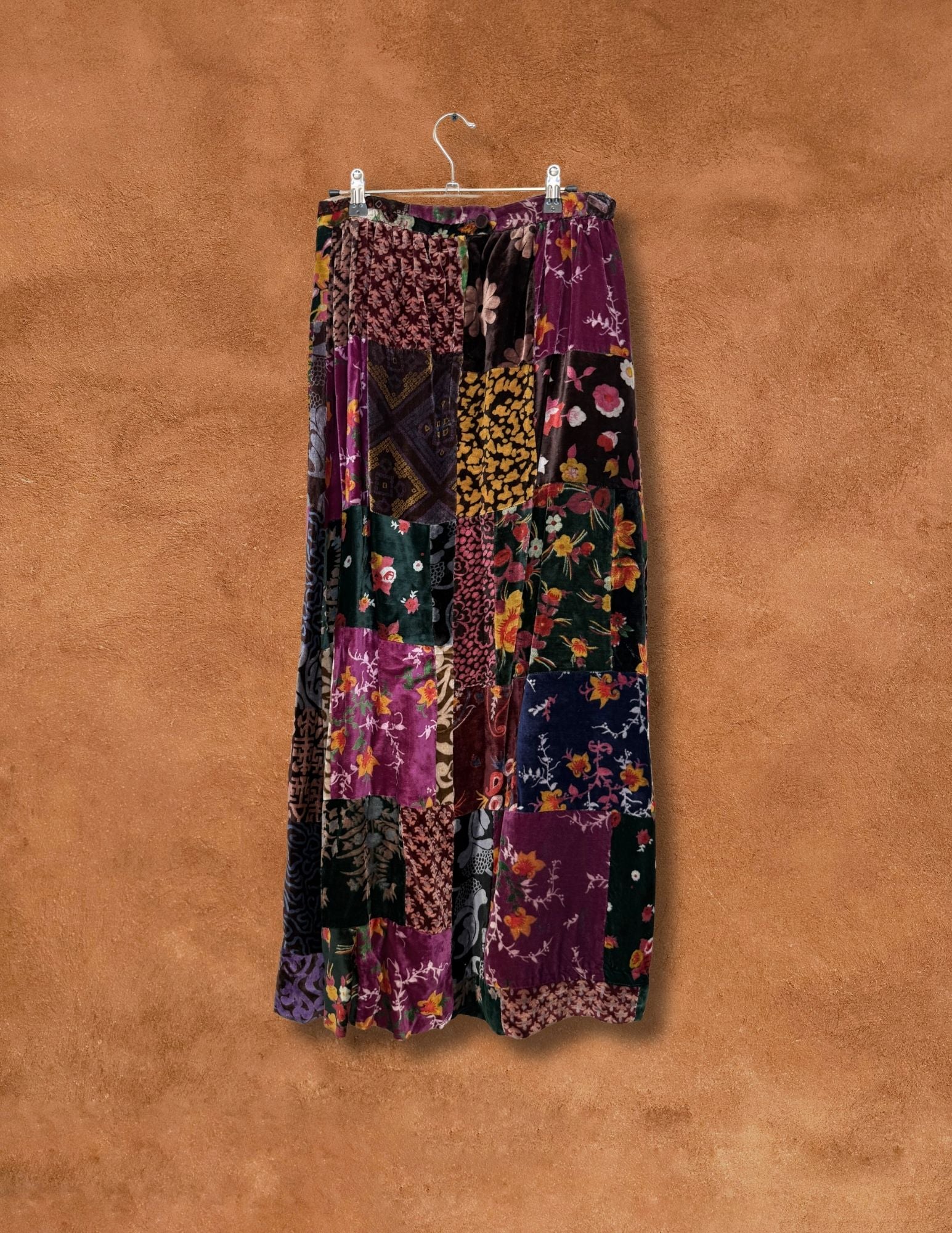 This vintage 1970s patchwork velvet bohemian skirt features an eclectic mix of floral, geometric, and textured panels in deep, jewel-toned hues. A full-length silhouette with beautiful movement, fully lined for comfort and structure.