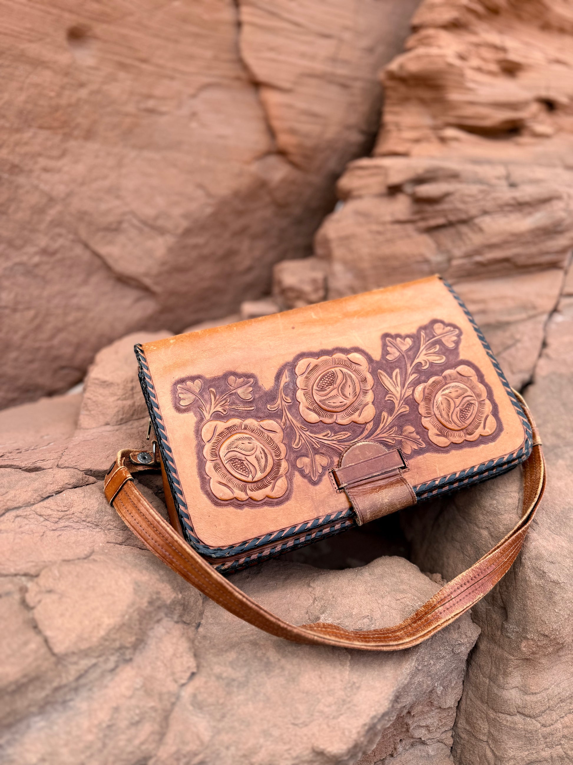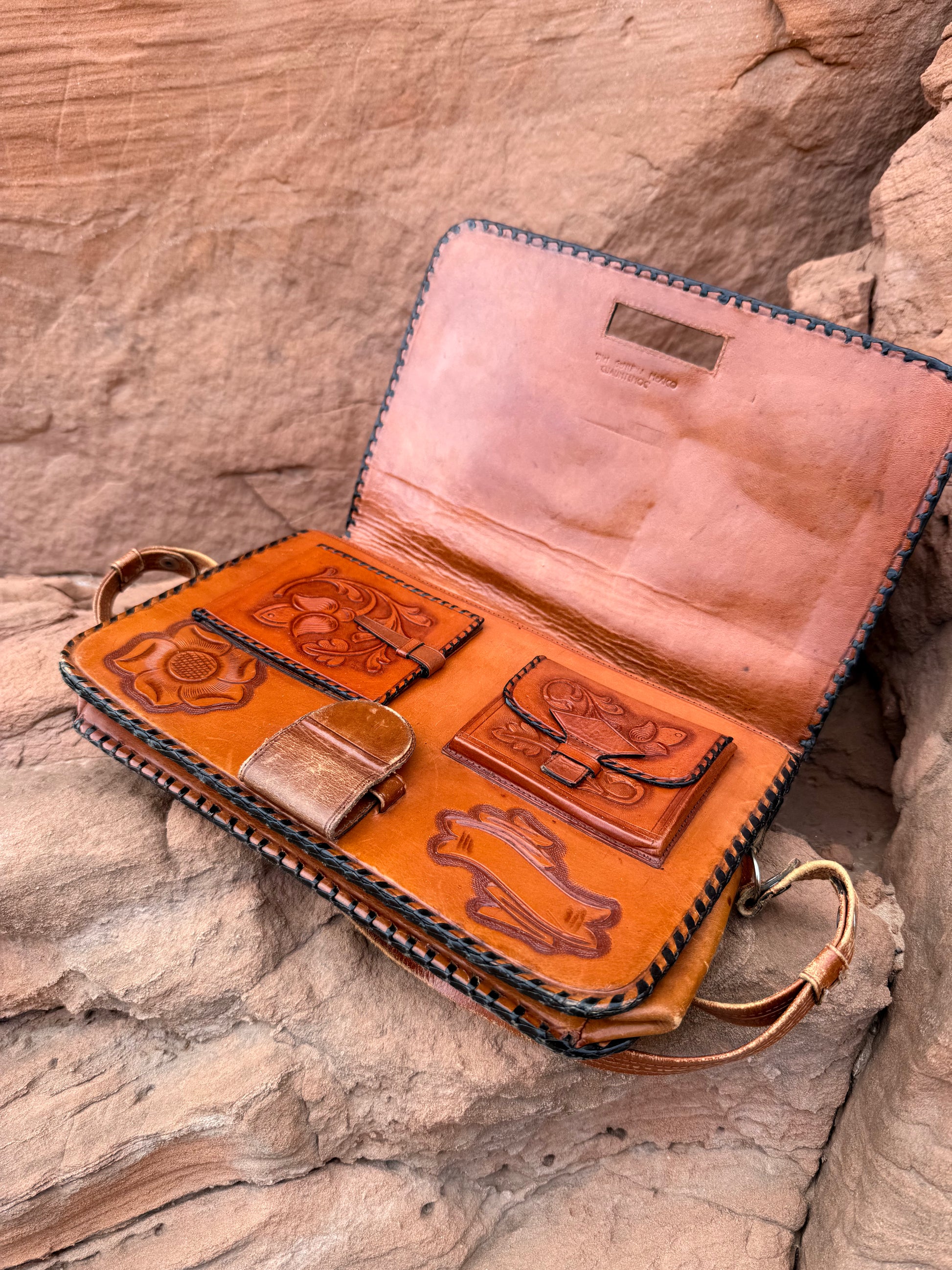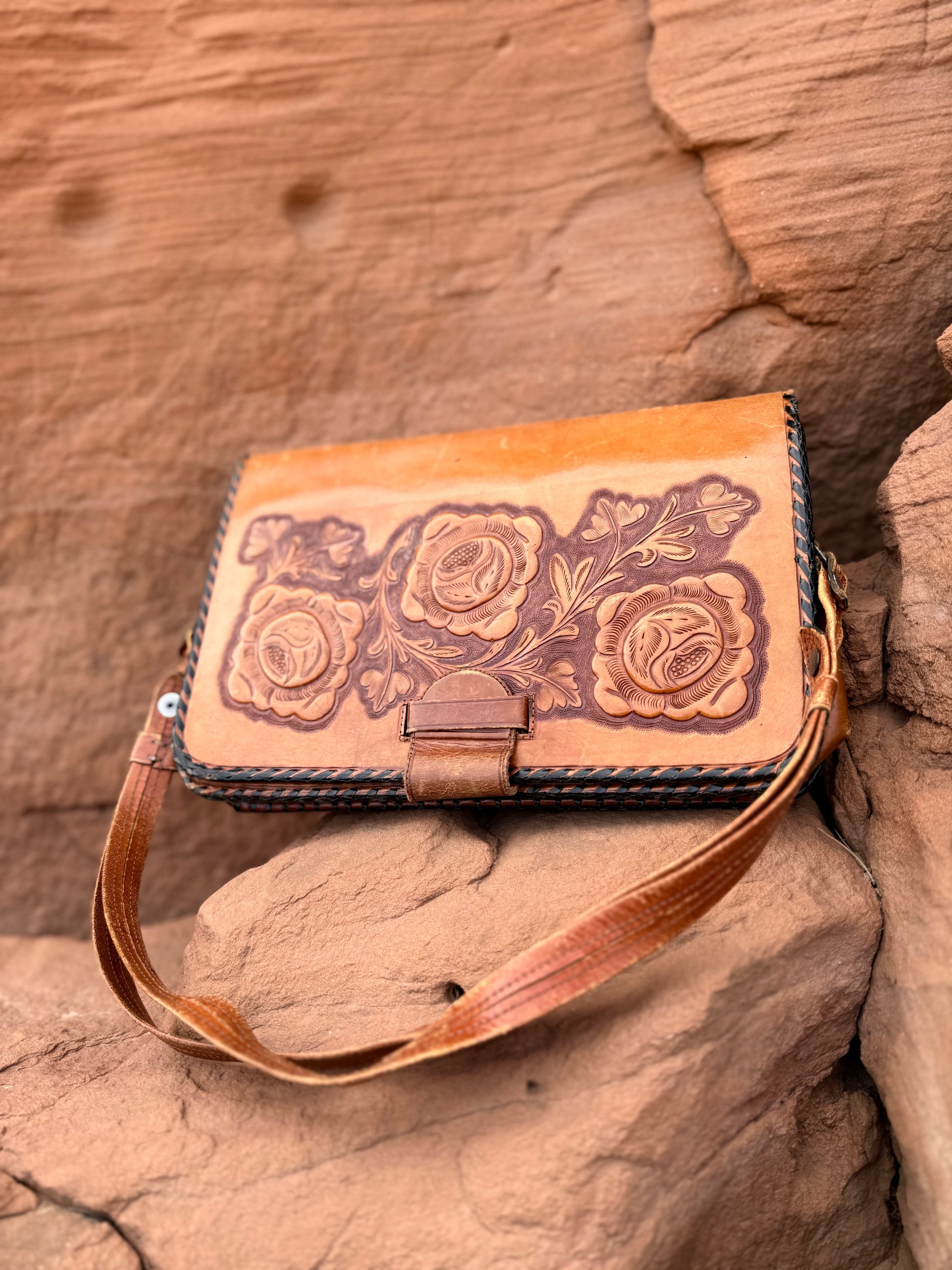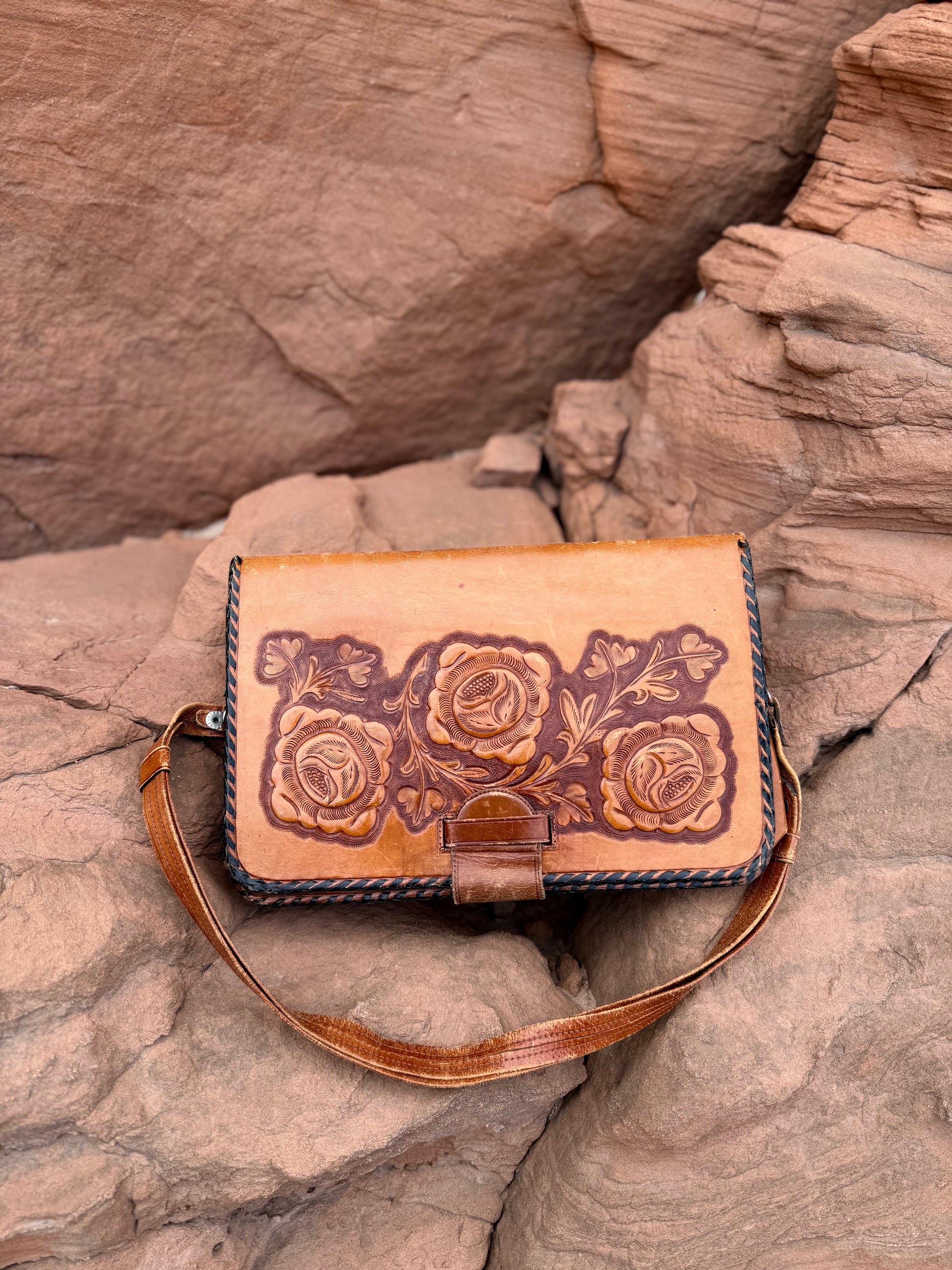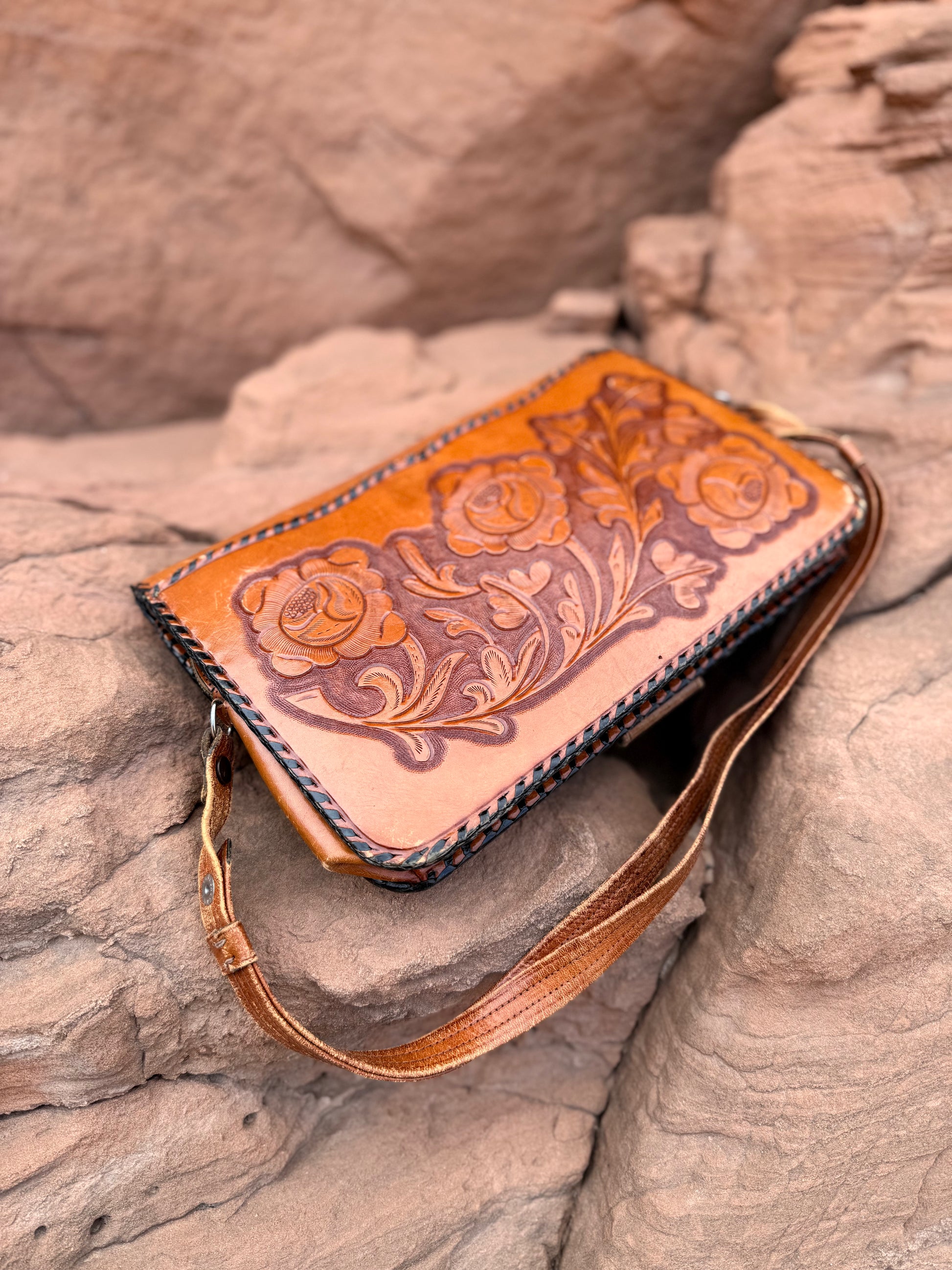 Outer Handtooled florals, opens to self wallet and coin purse. Three purse sections, one of them zippers shut.