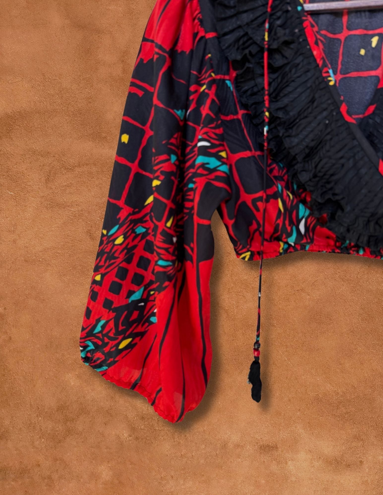 In a striking red-and-black geometric print with hints of teal and yellow, this top channels pure retro energy — made for dancing, dreaming, and everyday expression.