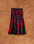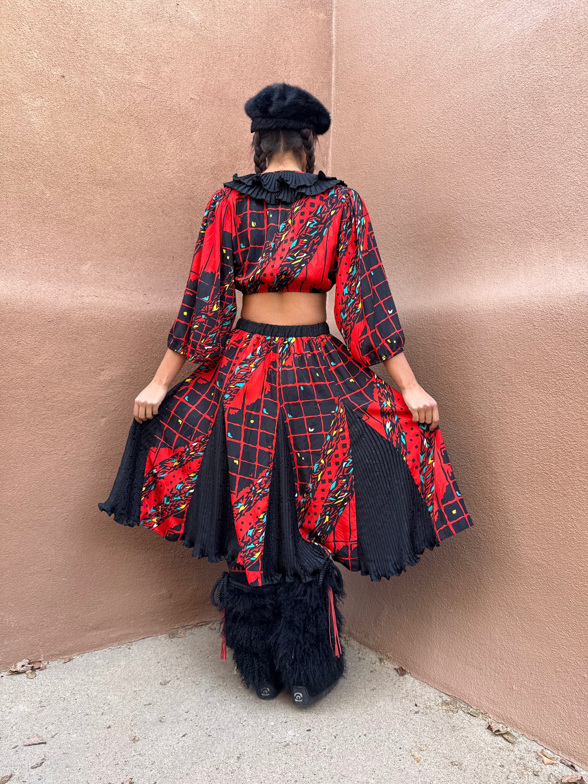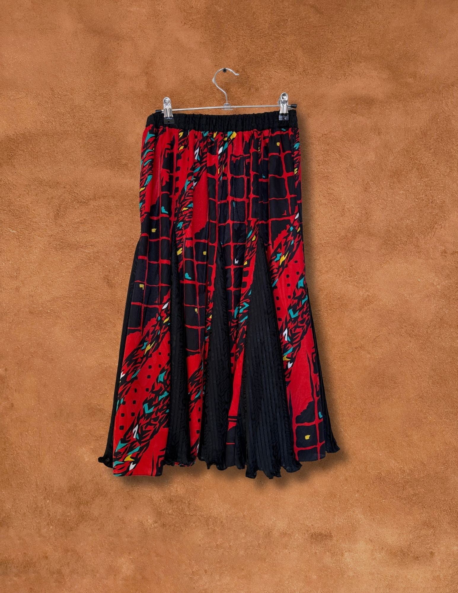 A vibrant statement piece from the 1980s — this flared skirt features bold geometric and abstract patterns in red, black, and hints of turquoise and gold.