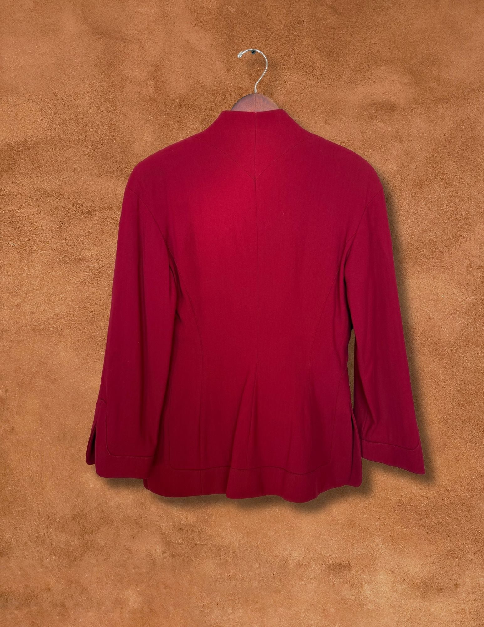 Preloved and preworn Thierry Mugler jacket in a striking deep crimson hue. Sculptural tailoring with Mugler’s signature architectural lines, a softly structured stand collar, and statement silver buttons at the front. Impeccably cut to contour the body while maintaining strength and elegance.