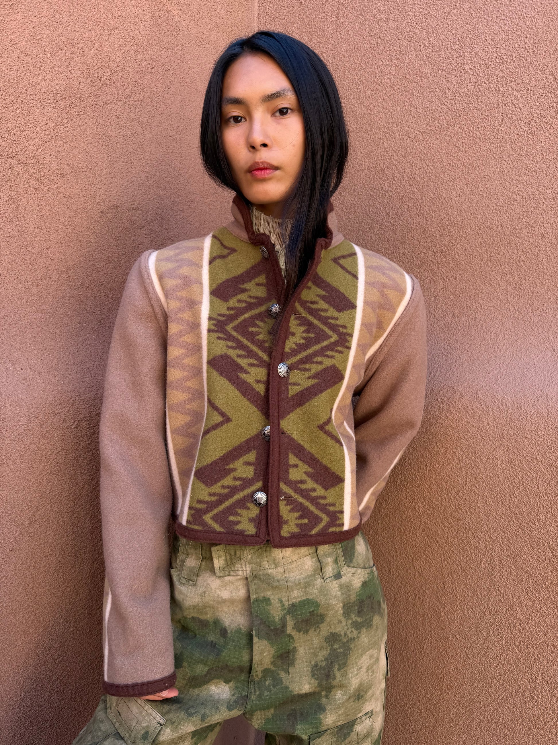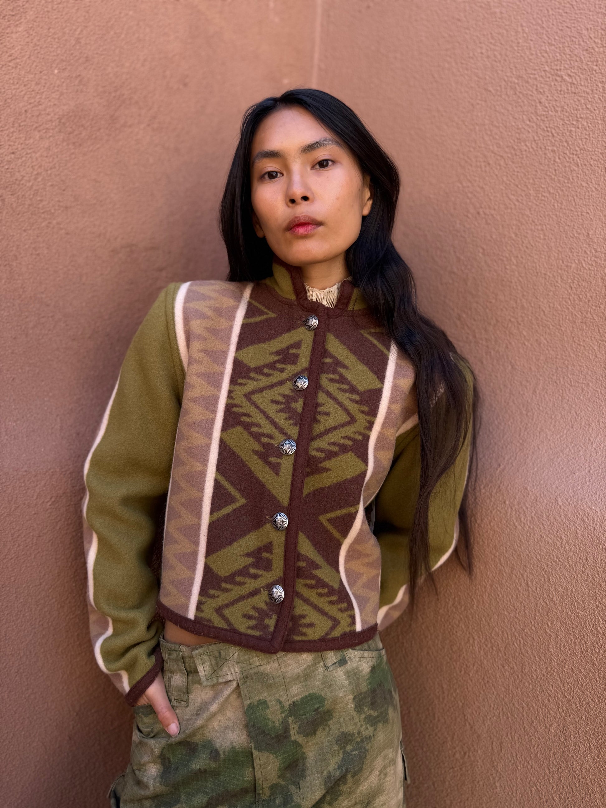 Rare find, this Santa Fe Blanket Coat is 82% Wool 18% Nylon, with Metal Conch Buttons. Unlined, bound edging. Reversible can be work on either side. Leather trim on pockets. 2 Coats in 1.