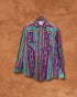 A true rodeo classic from the 1980s, this vintage shirt features a striking abstract Southwest-inspired pattern that embodies bold Western style. Designed with front button closure, cuffed sleeves, western yoke, and chest pockets, it blends utility with statement design.