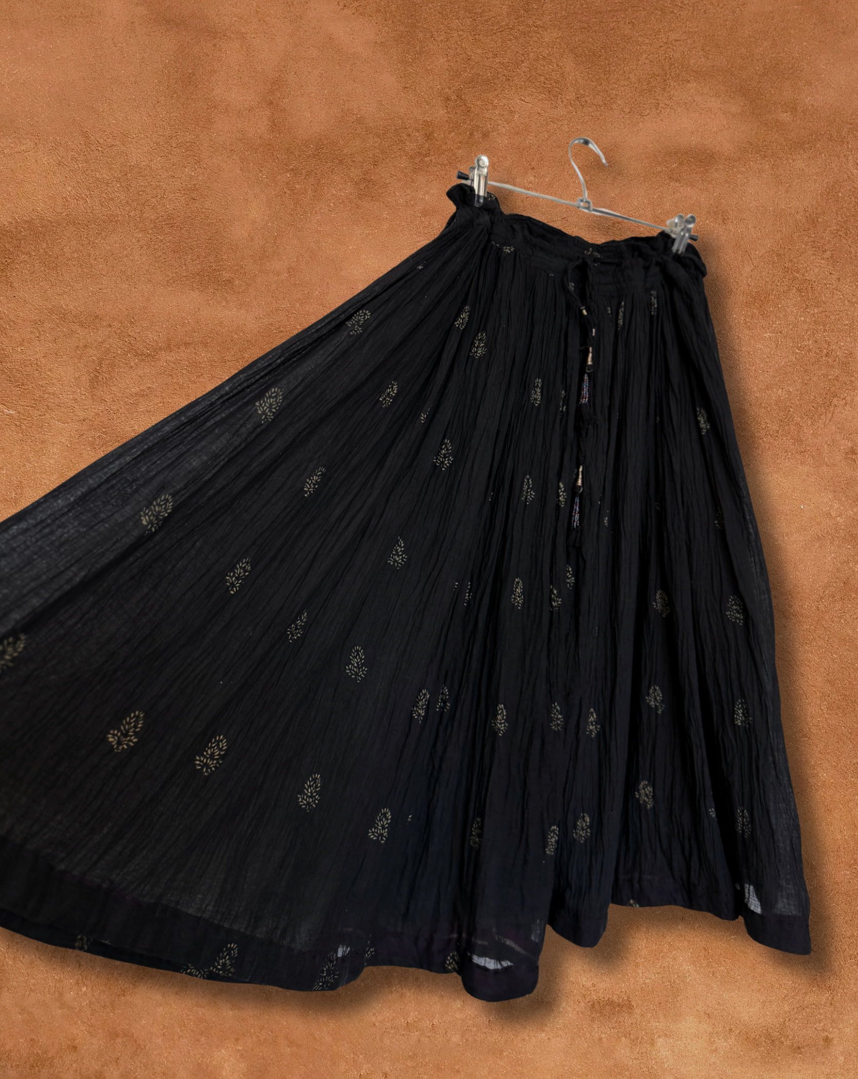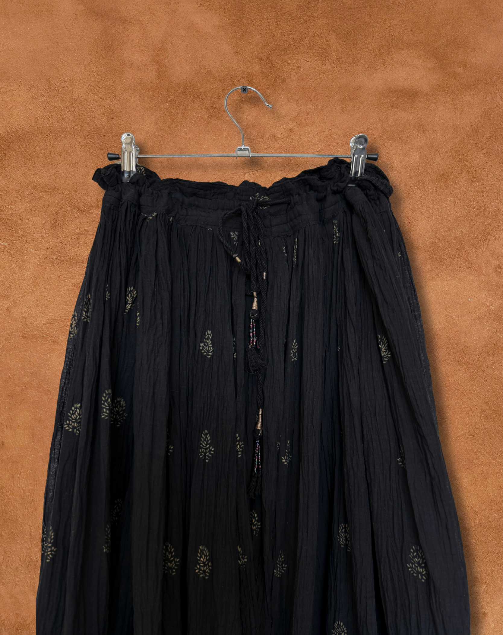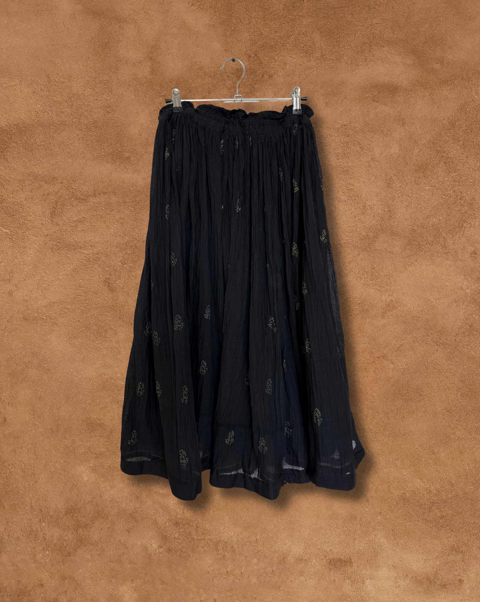 Lightweight and effortlessly elegant, this vintage India cotton skirt features a drawcord waist, sheer soft cotton, and delicate gold hand-printed motifs throughout. Its flowy, voluminous shape moves beautifully, making it perfect for warm-weather days, layering with boots and knits, or styling for a bohemian look.