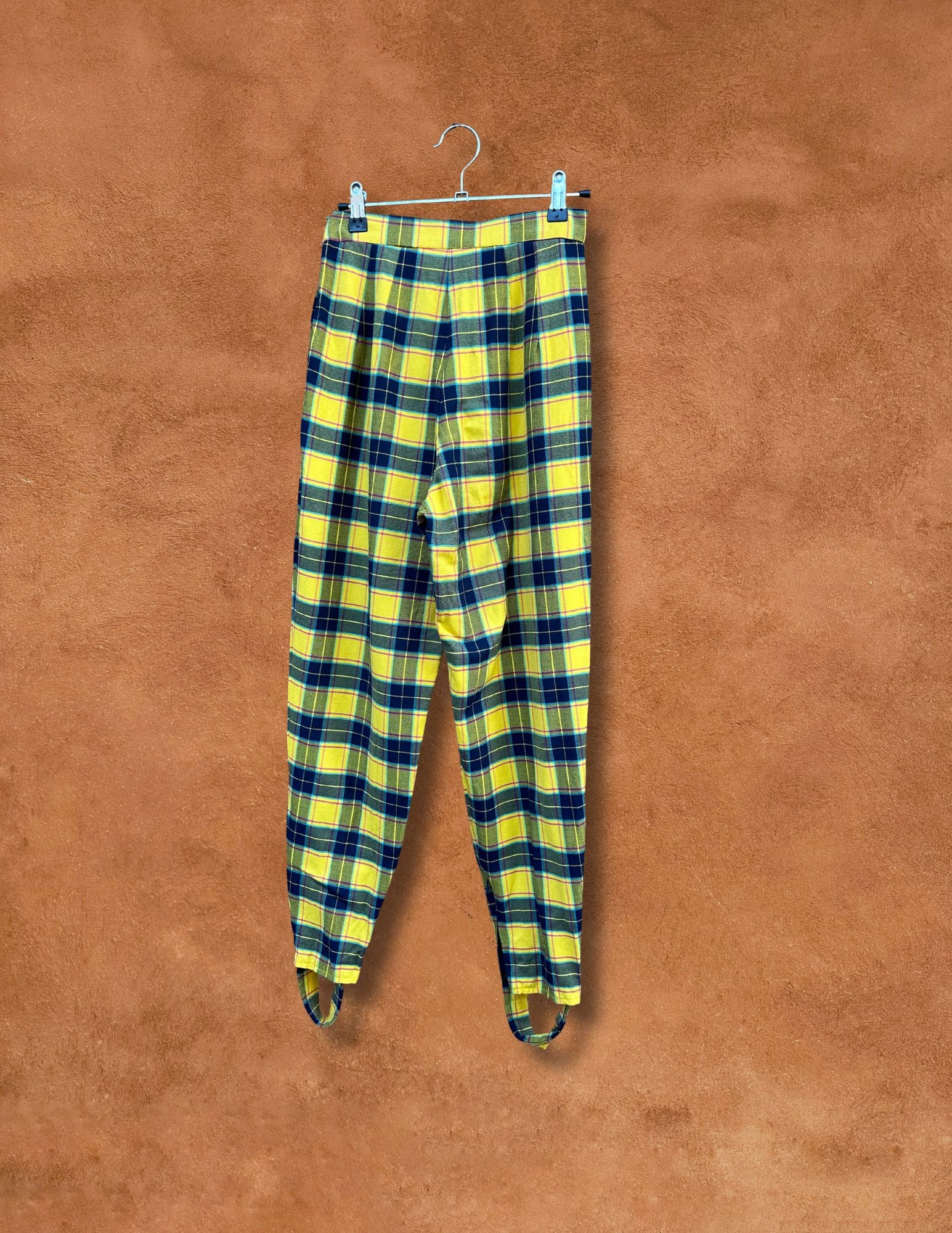 Vivid 80s stirrup pants, electric plaid. Side button closure with zipper. Pleated front, and side pockets. High Rise. 75% Rayon 23% Nylon 2% Elastin. Tapered leg. Inner zipper at stirrup.