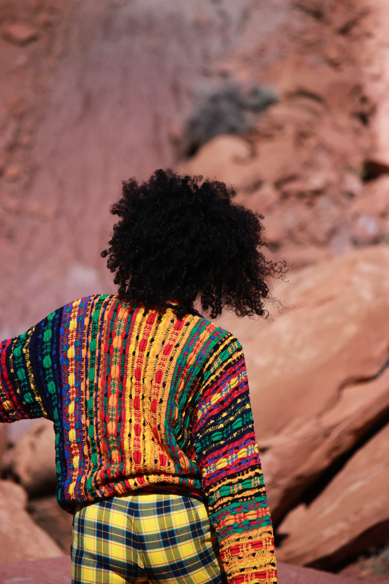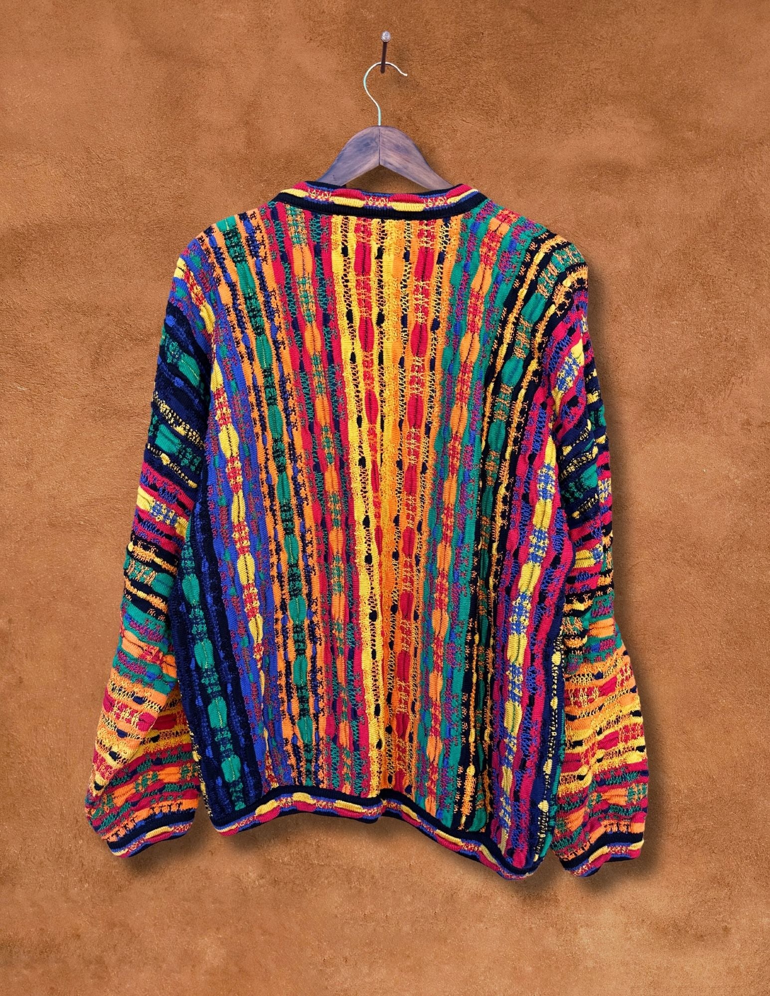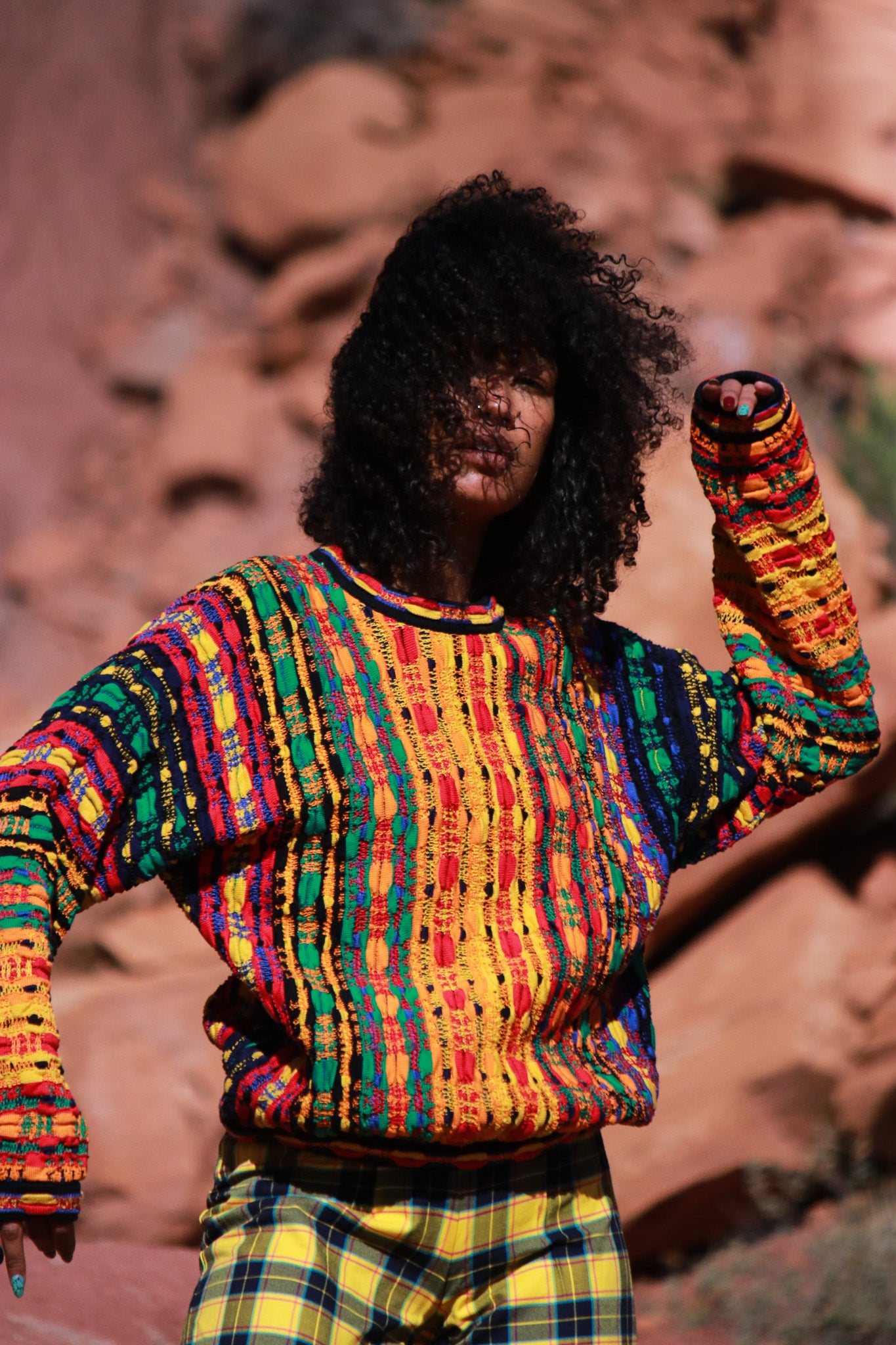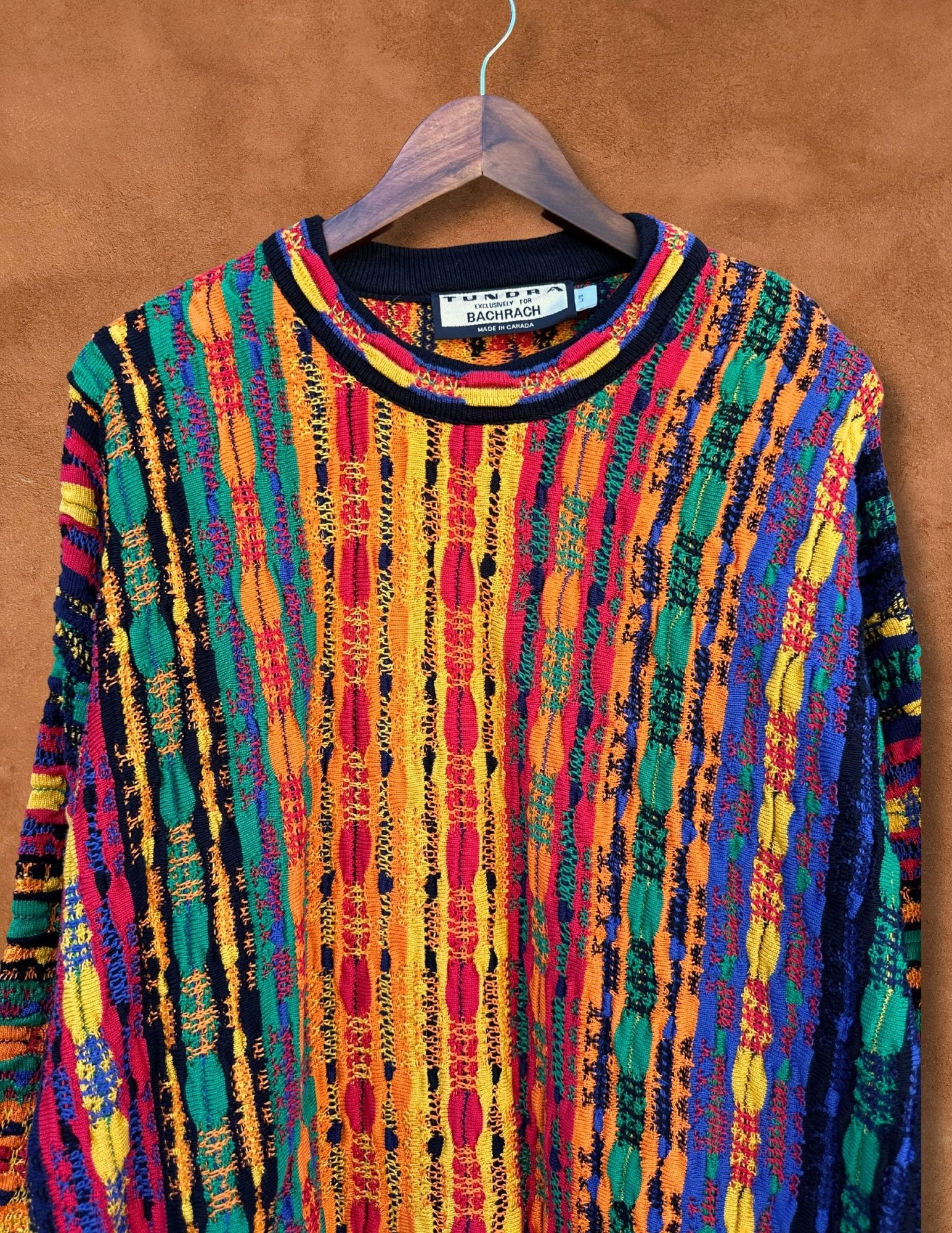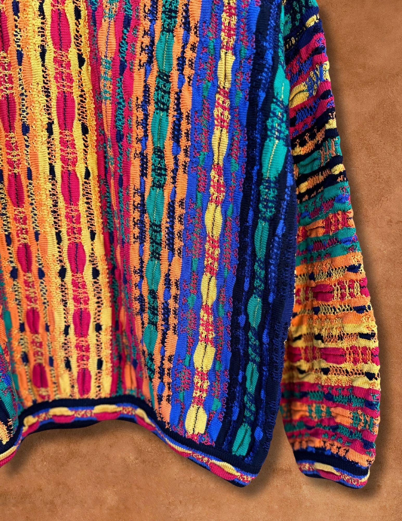 Technicolor textures! This extraordinary sweater, is 80’s Biggie Small vibes made of vivid knit. Classic oversized cut.