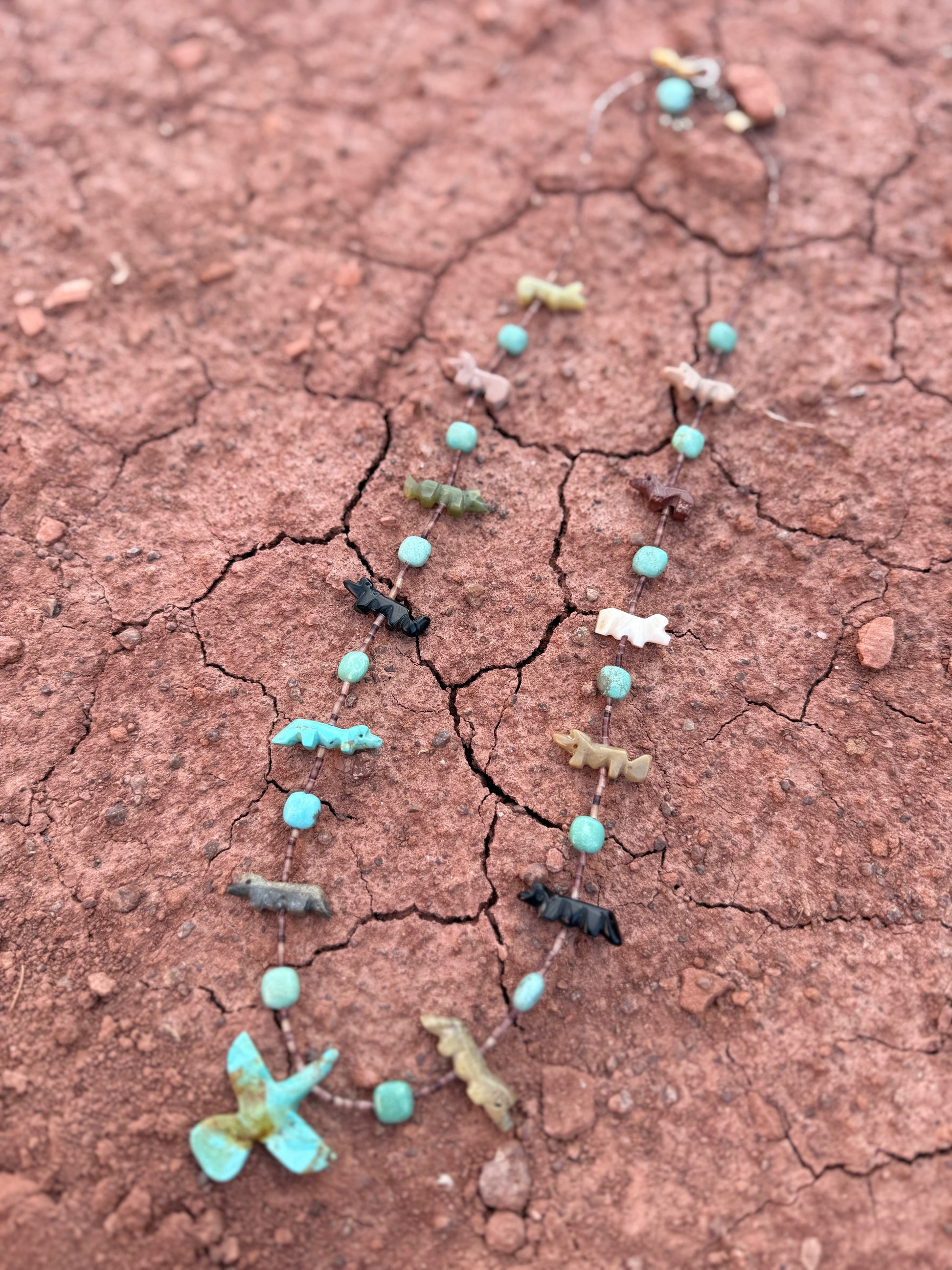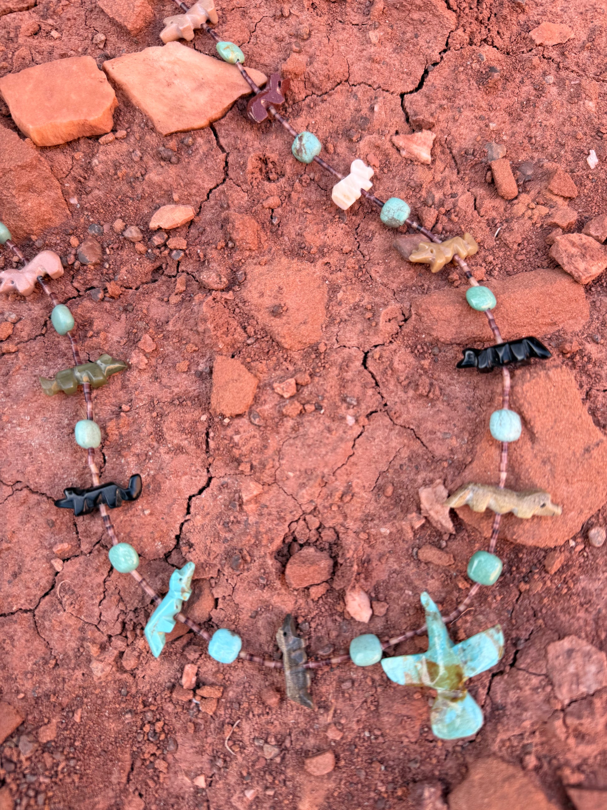 A stunning vintage necklace featuring carved animal fetishes—bear, thunderbird, and other traditional forms—paired with classic Southwest heishi beads. Each fetish is individually carved from natural stones including turquoise, onyx, shell, and quartz, creating a vibrant strand full of meaning, motion, and spirit.