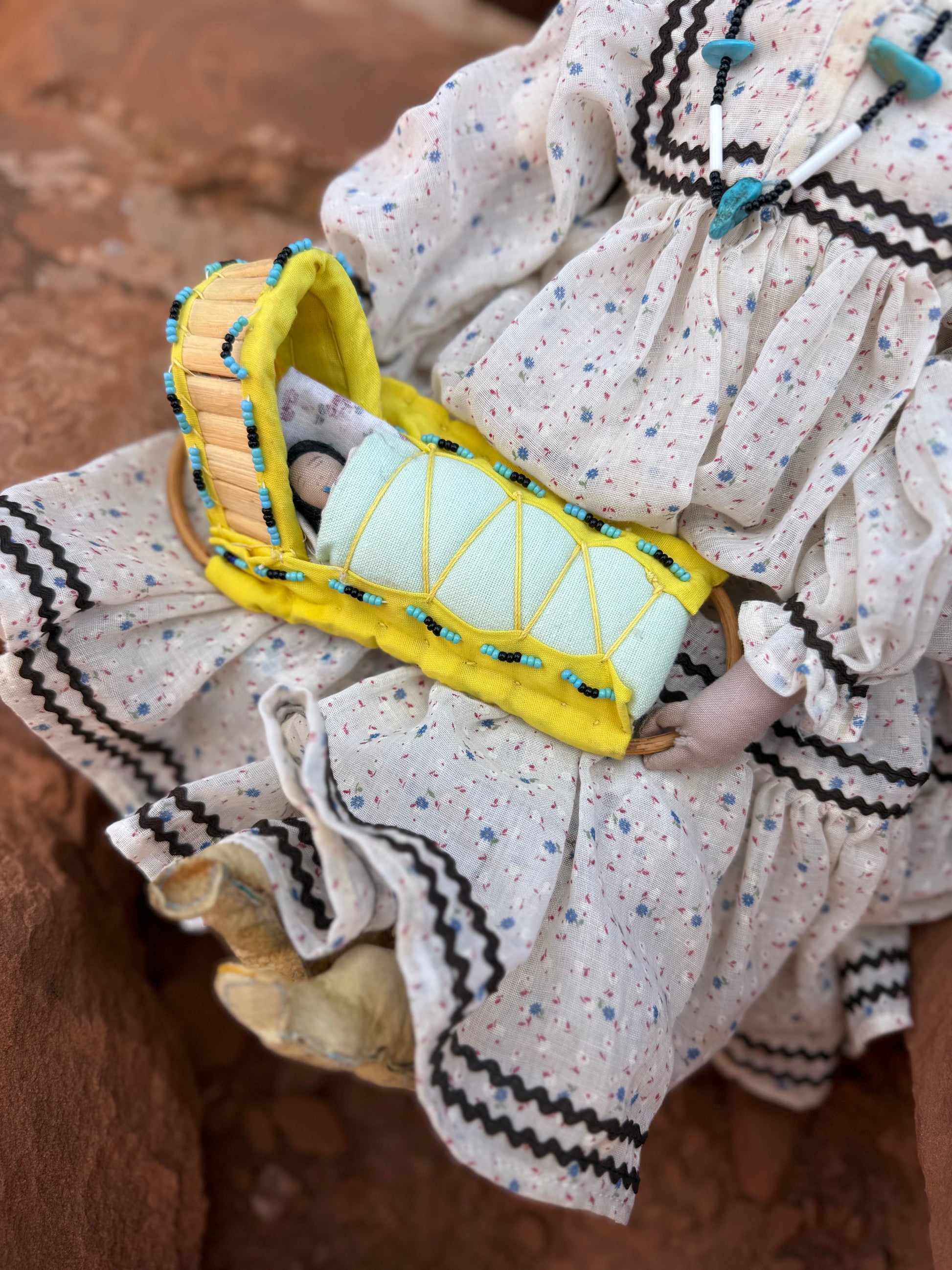 A beautifully crafted vintage handmade doll, measuring 18" long, complete with a traditional-style cradleboard and hand-filled turquoise necklace and earring set. This one-of-a-kind piece makes a meaningful addition for collectors and lovers of handmade work.