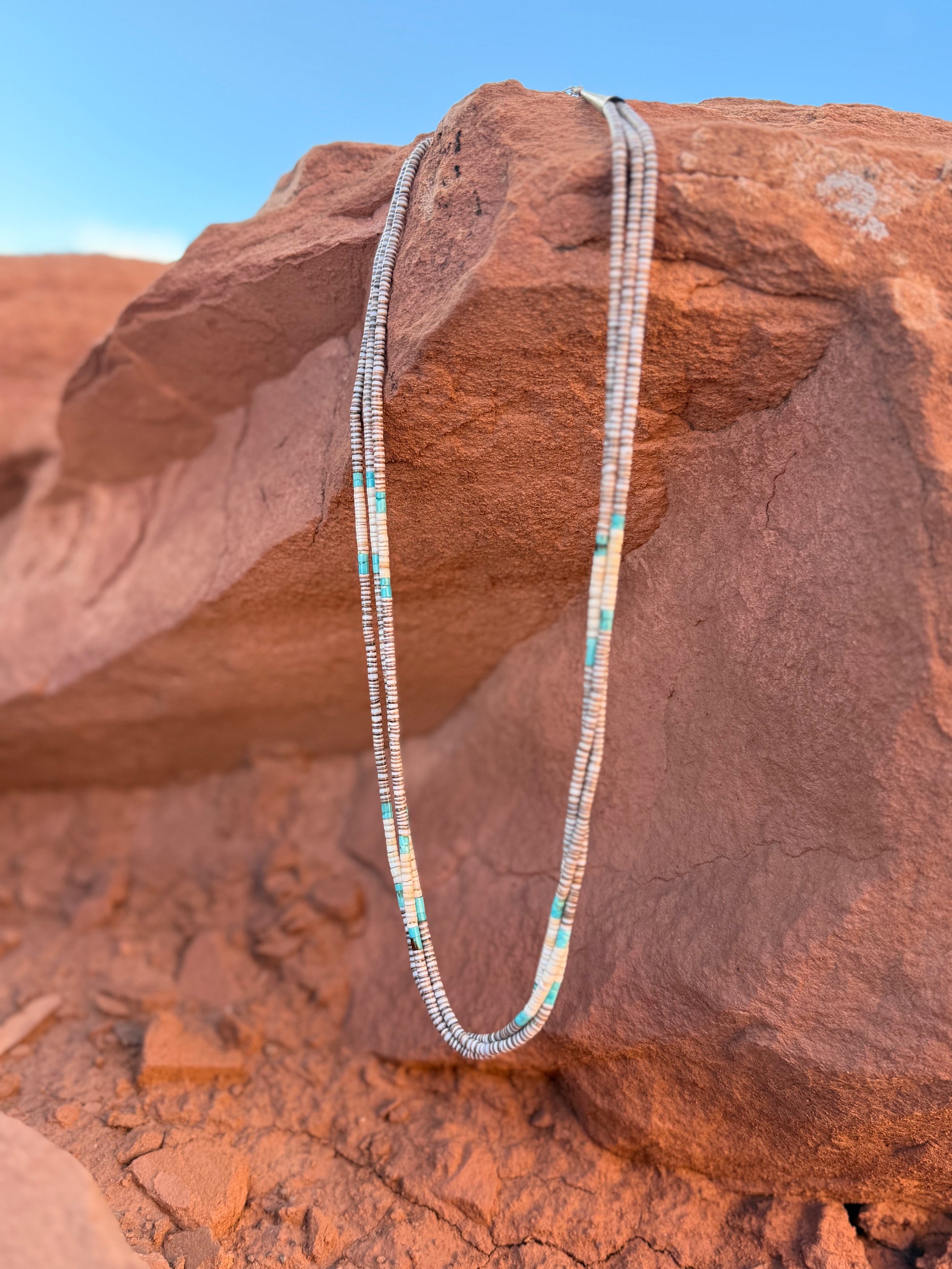 A beautiful vintage strand featuring classic Southwest heishi beads paired with natural turquoise accents. Hand-strung with traditional technique, this 26" necklace carries organic movement, rich earthy tones, and the timeless balance of shell and stone.