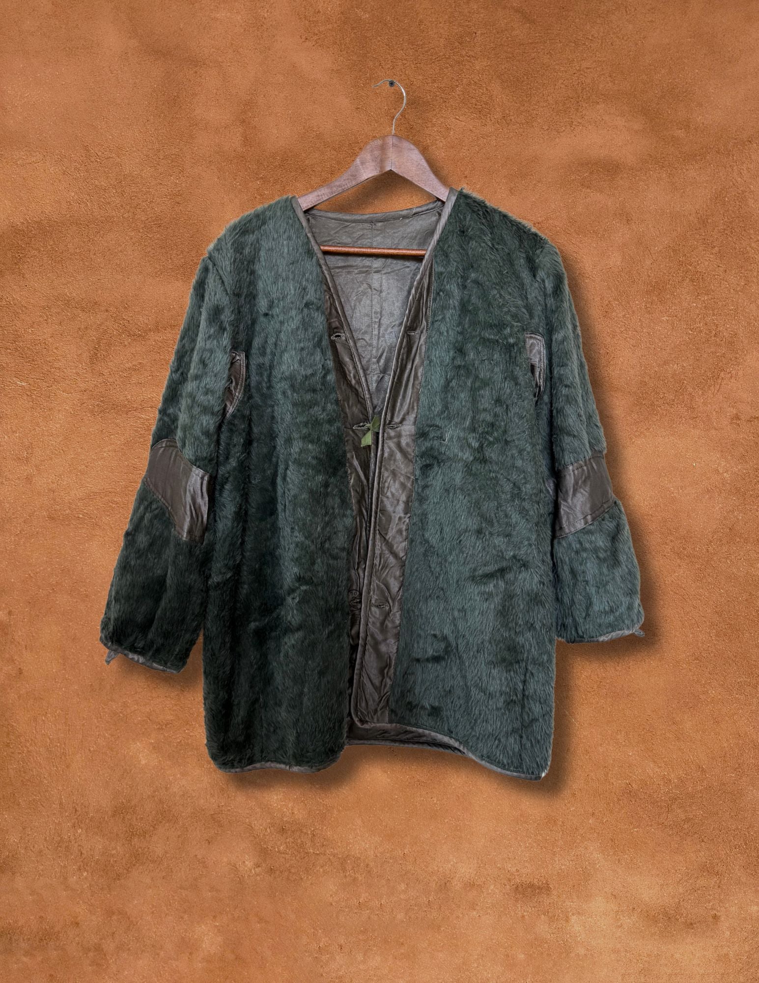 Preloved and preworn, this rare mid-century Greek military jacket is crafted with a satin shell and distinctive military detailing, finished with a tie-front closure and vintage brocade pocket accents. Fully reversible, it features a plush furry lining that can be worn to the outside—offering two looks in one timeless piece.