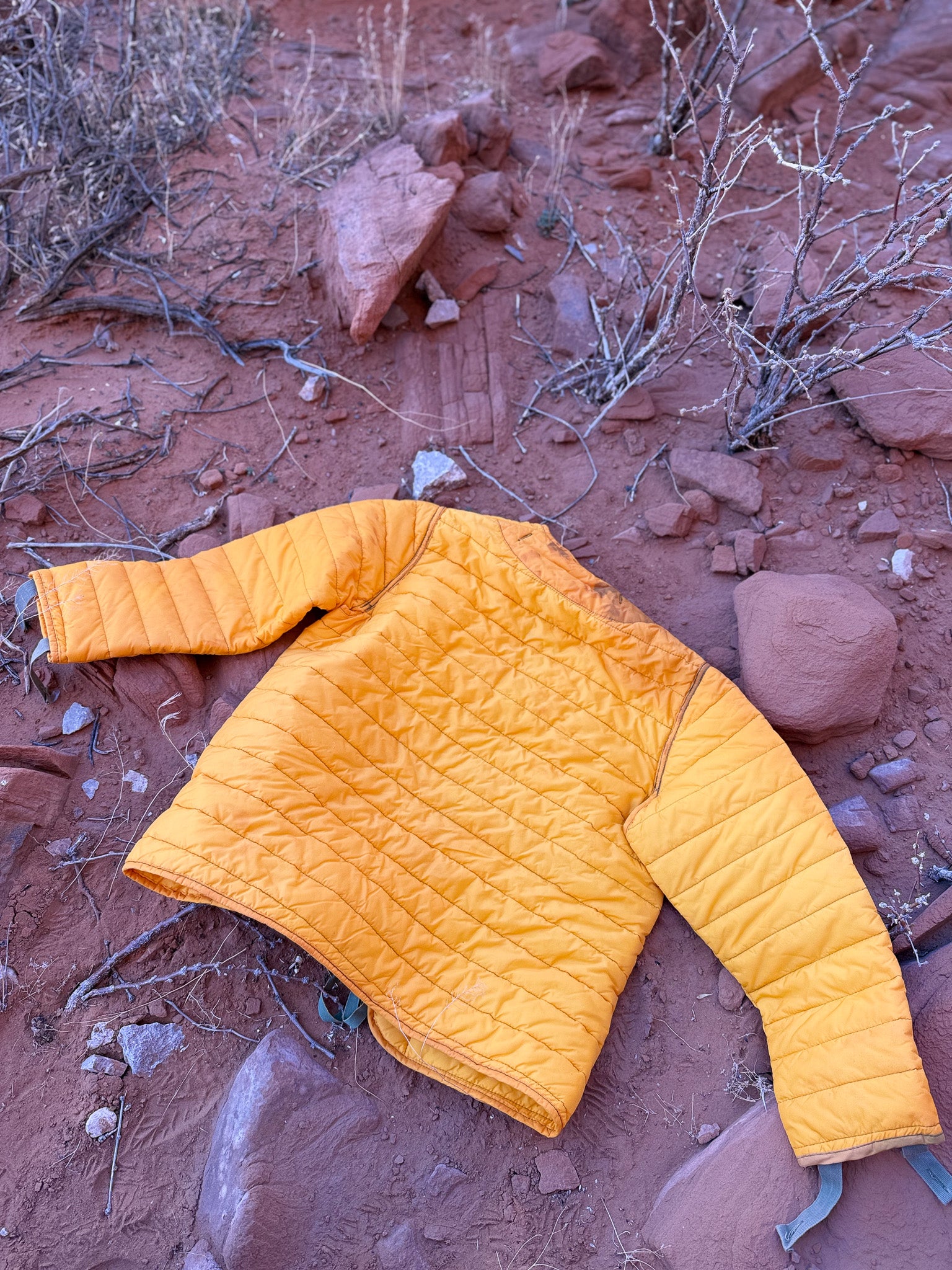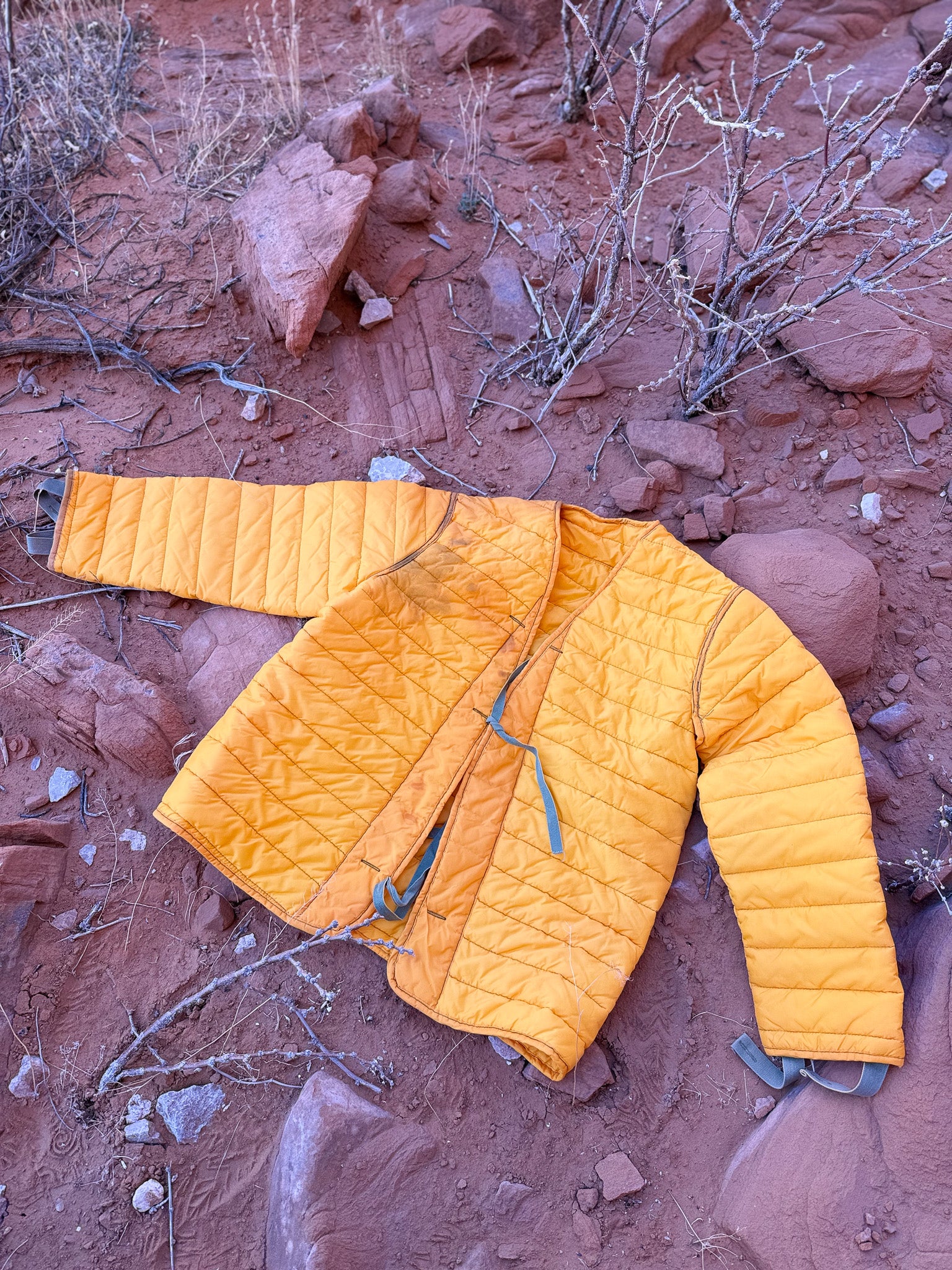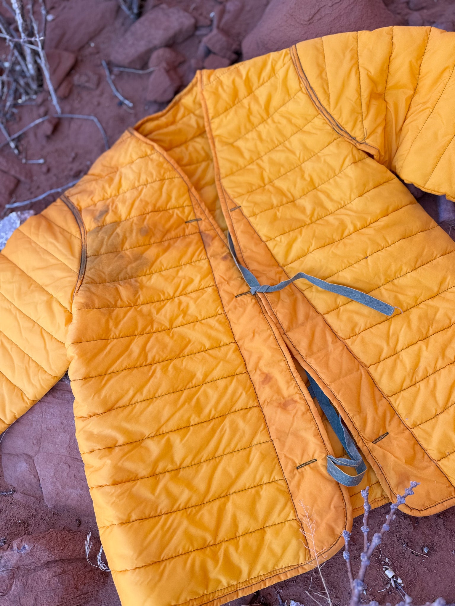 100% nylon quilted liner from mid-century military. Tie Front. Can be cuffed, with small underarm opening for range of movement. Perfect layer for cozy nights by the fire.