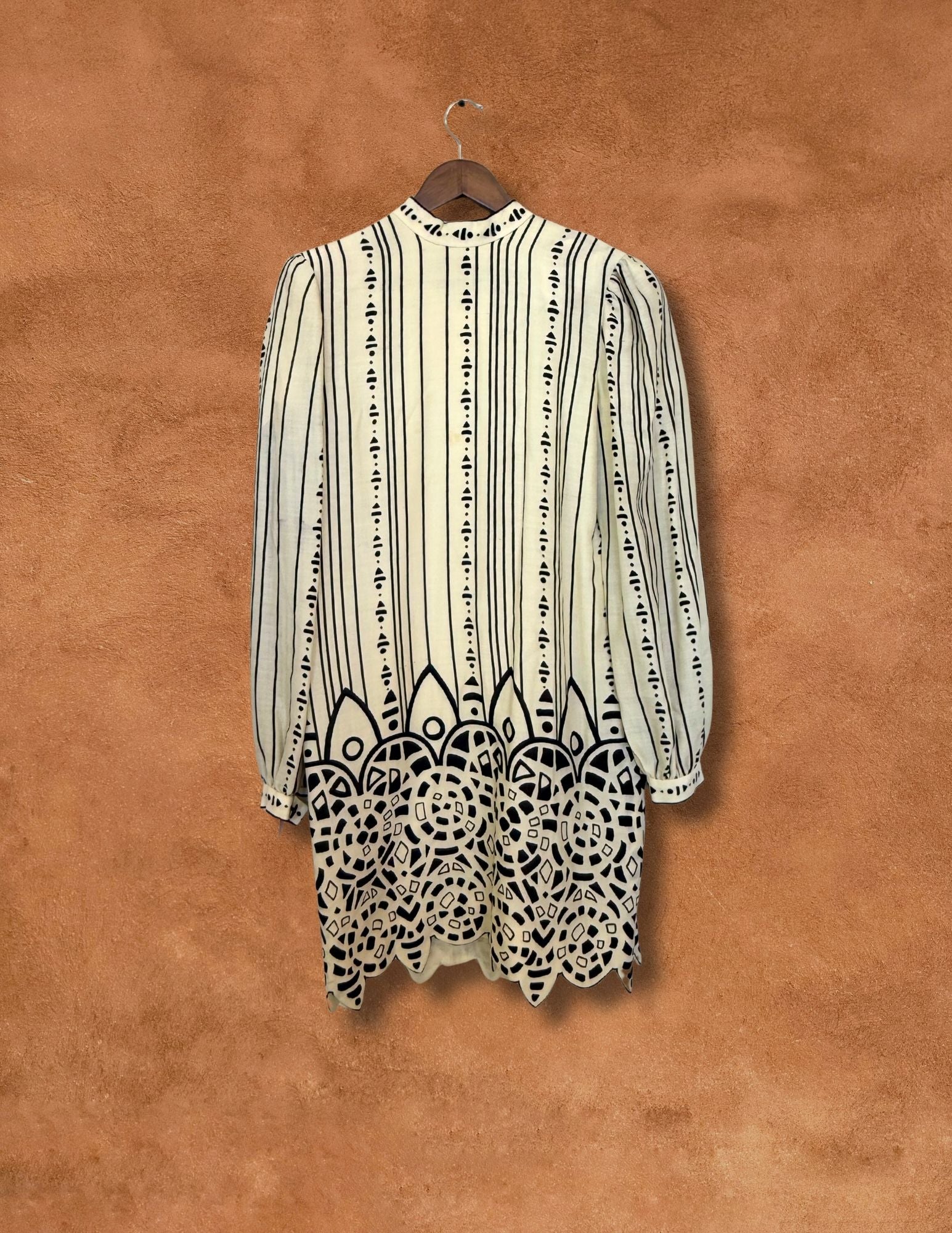 This vintage Pauline Trigère patterned dress features a striking black-and-ivory graphic print with a beautifully tailored silhouette. Fully lined for structure and comfort, the dress includes a back zipper closure and long sleeves for an effortlessly refined look.