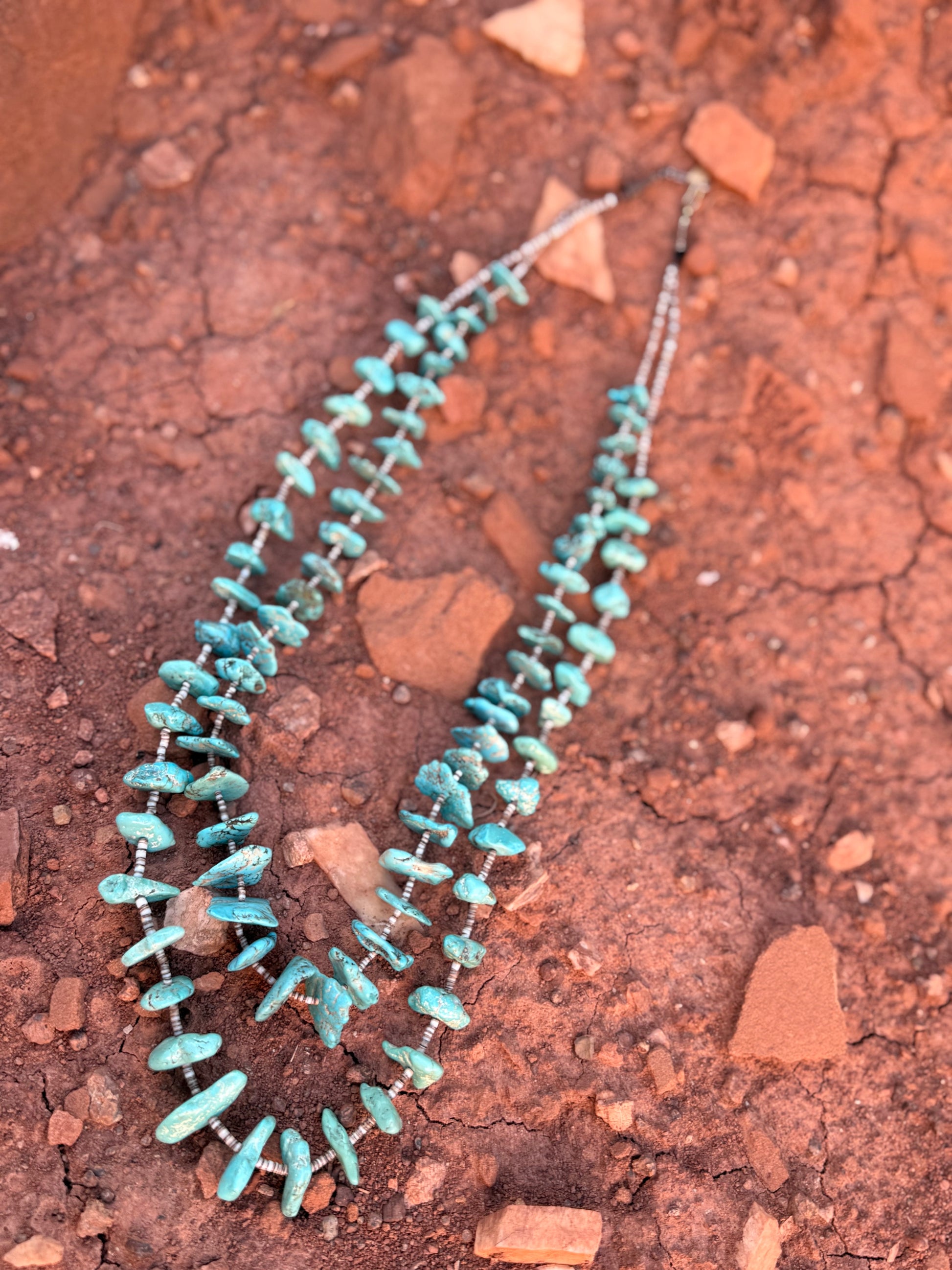 A stunning vintage double-strand necklace featuring natural turquoise paired with traditional heishi shell beads. Hand-strung in the Southwest, this piece reflects generations of Indigenous jewelry-making — earthy, grounding, and full of spirit.