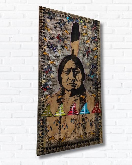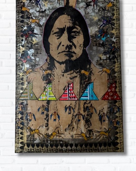“When You Run with the Bulls” transforms the tradition of Plains ledger art into a modern arena of expression — where sacred symbols, urban movement, and ancestral memory converge in color, rhythm, and resistance.